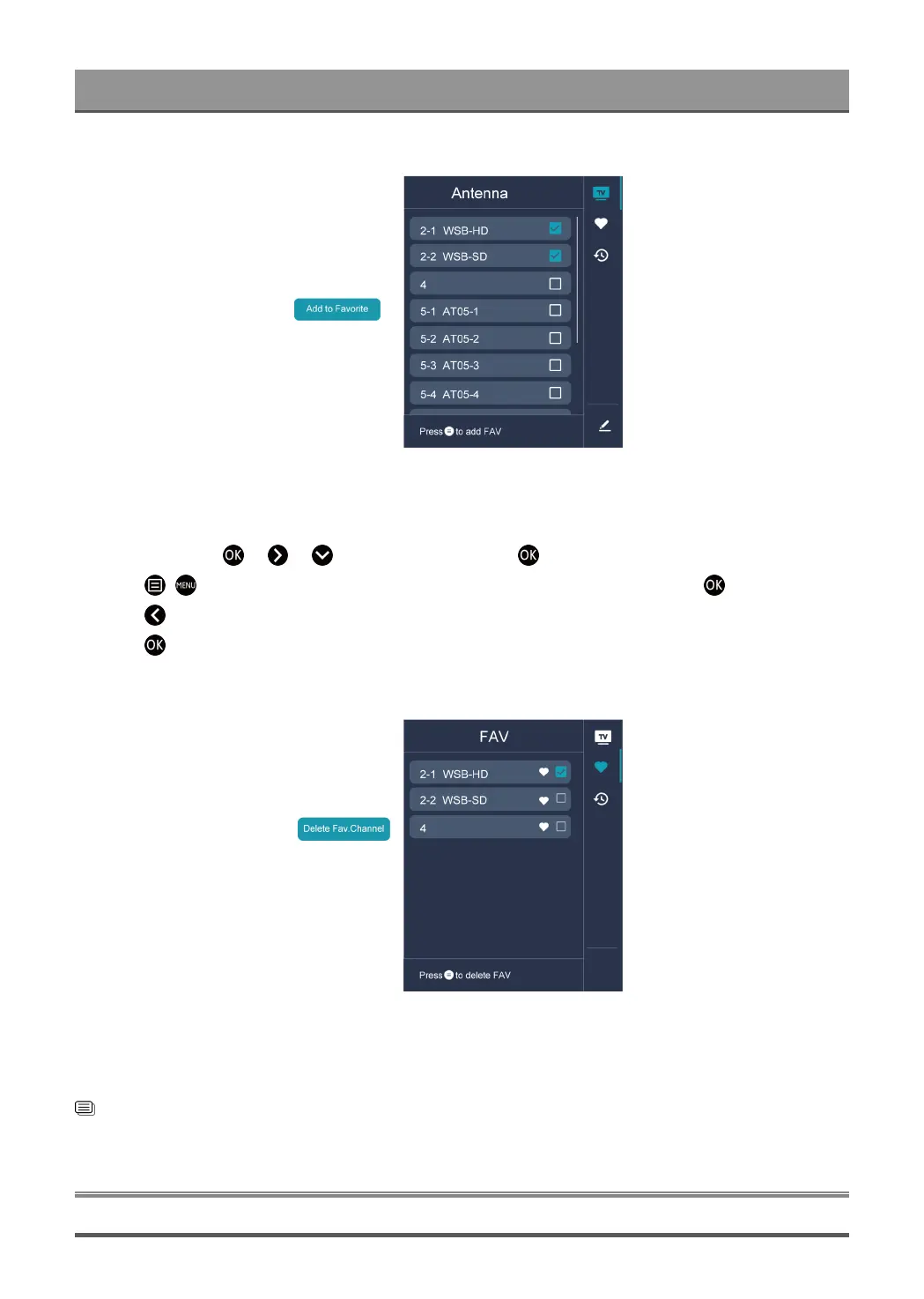 Press / , select the channel(s) you want to delete to the favorite list by pressing button.