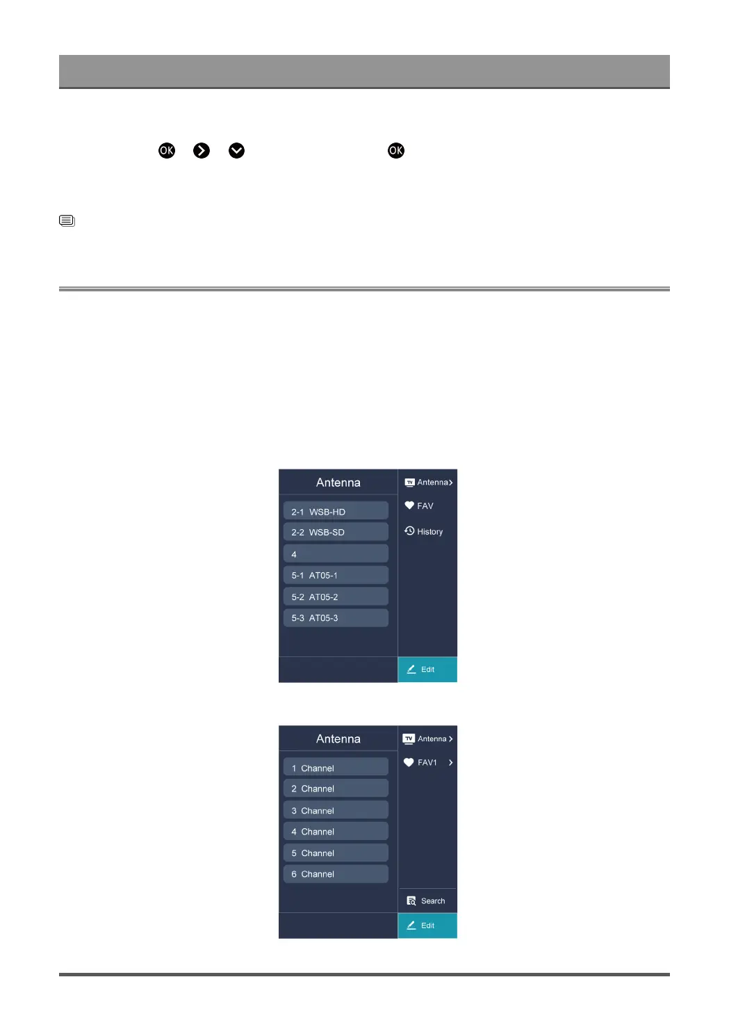 In Live TV, press > > to select FAV, and press button to display the favorite list.