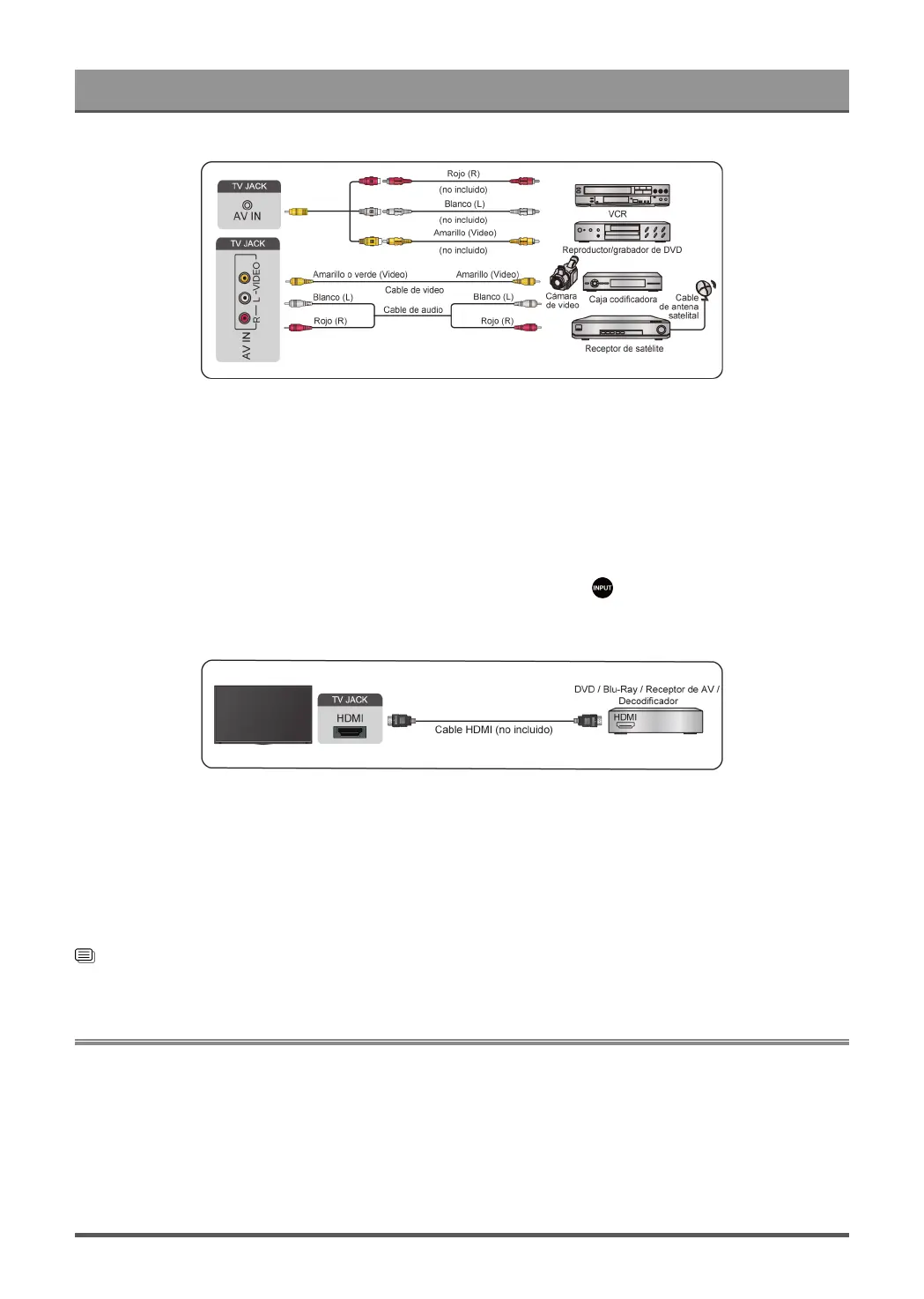 Para conectar un dispositivo AV con un cable HDMI (no incluido), vea la ilustración a continuación.