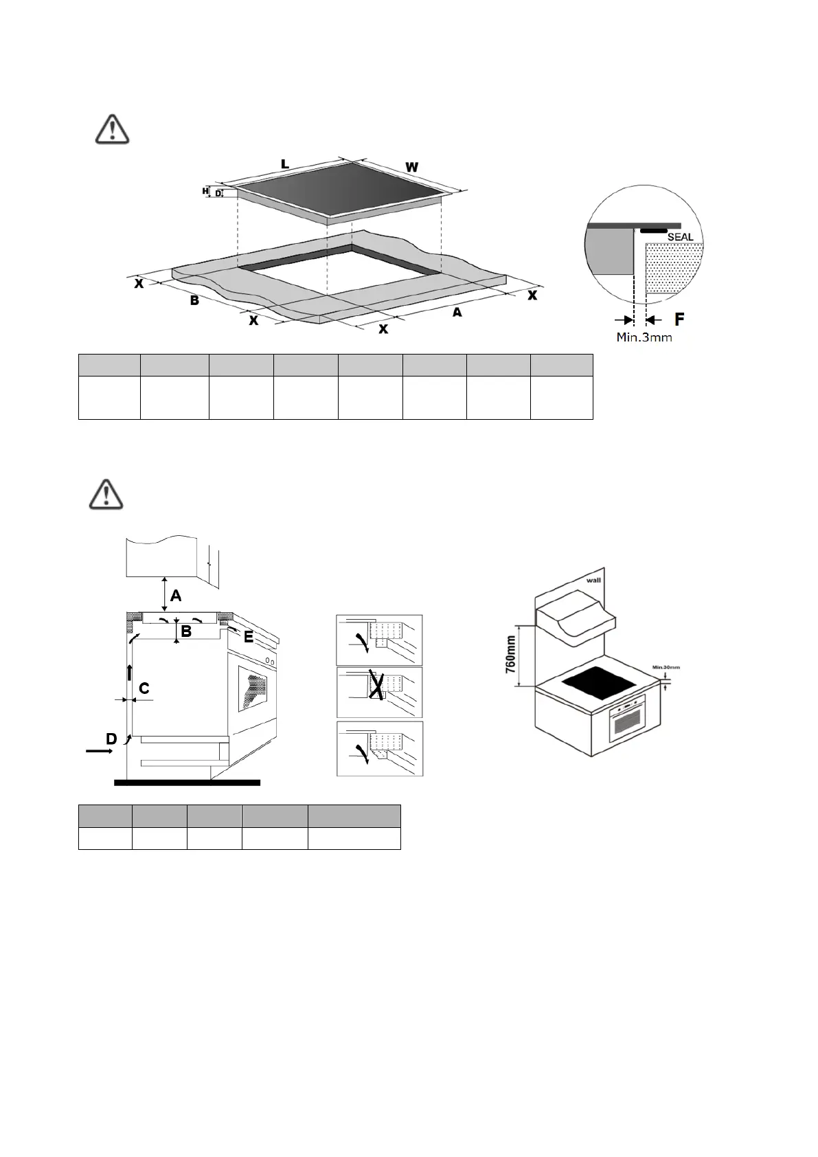 Note: The safety distance between the hotplate and the cupboard above the hotplate should be at