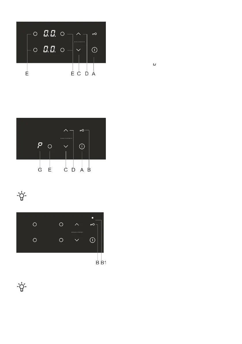 Power level can be changed at any time by selected the desired cooking zone (E) and adjusting the setting by touching