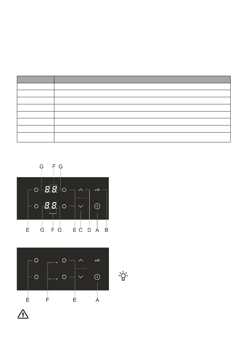 Cooking zone heat power can be set to ten different levels. The table lists some examples of use for each level.