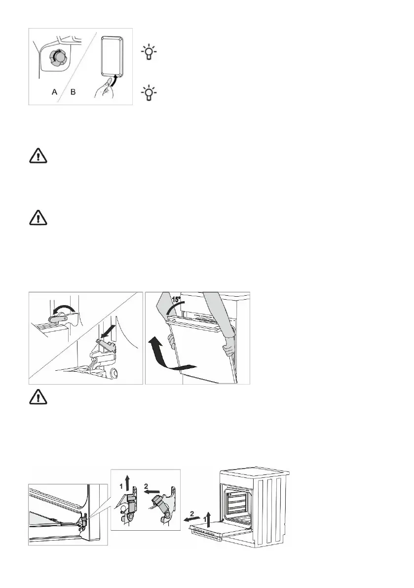 15° (regarding to the closed door position), slightly close the door and pull it out from both hinges of the appliance.
