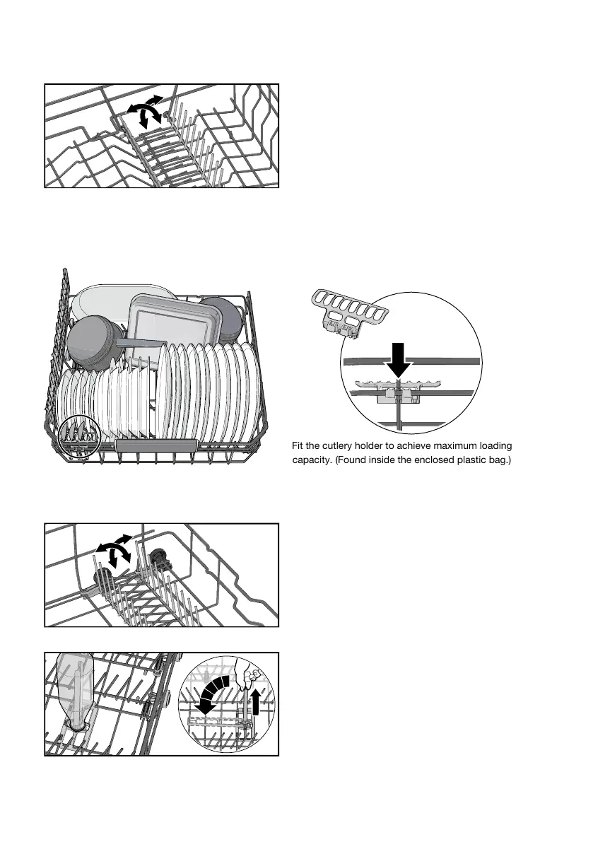 Place plates, side plates, serving dishes and pots in the lower basket. Cutlery can be placed in the