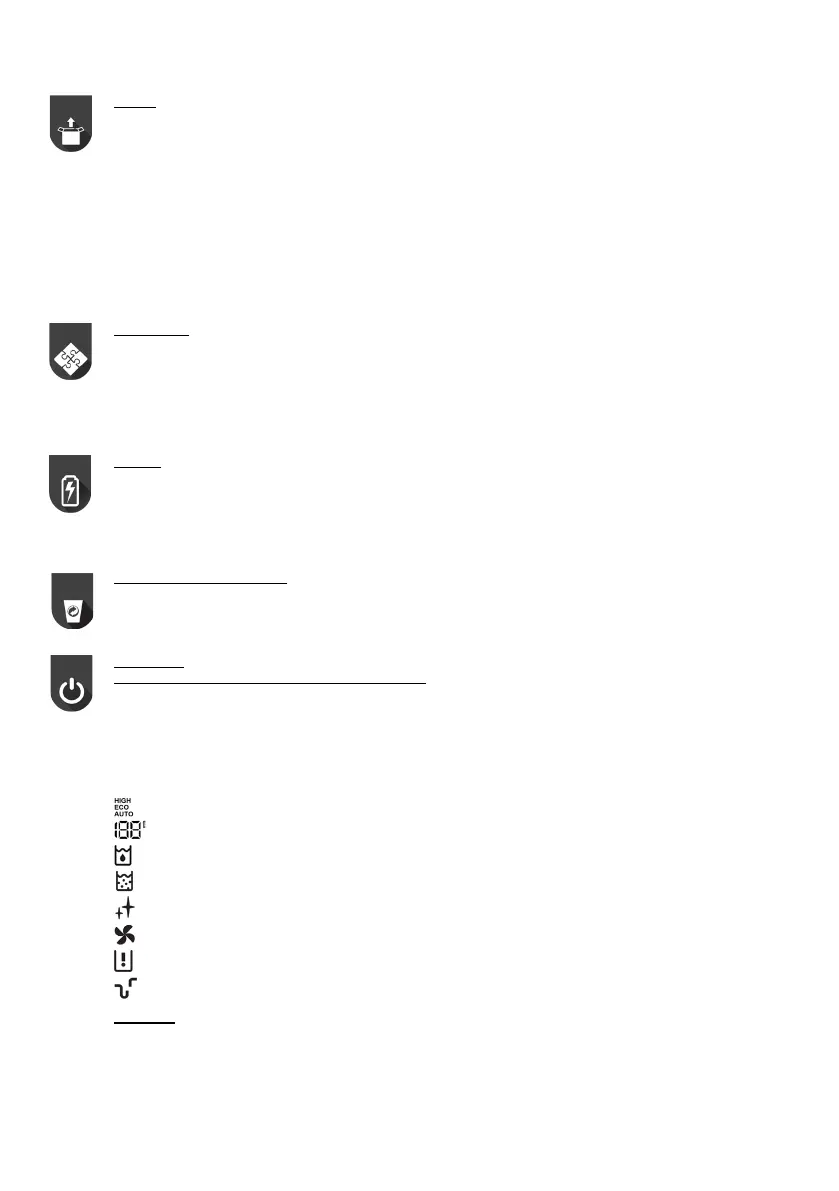 Betjening: ECO (inntil 20 min) / AUTO (inntil 25 min). På displayet på kabinettet vises ulike funksjoner. Alle funksjonene vises