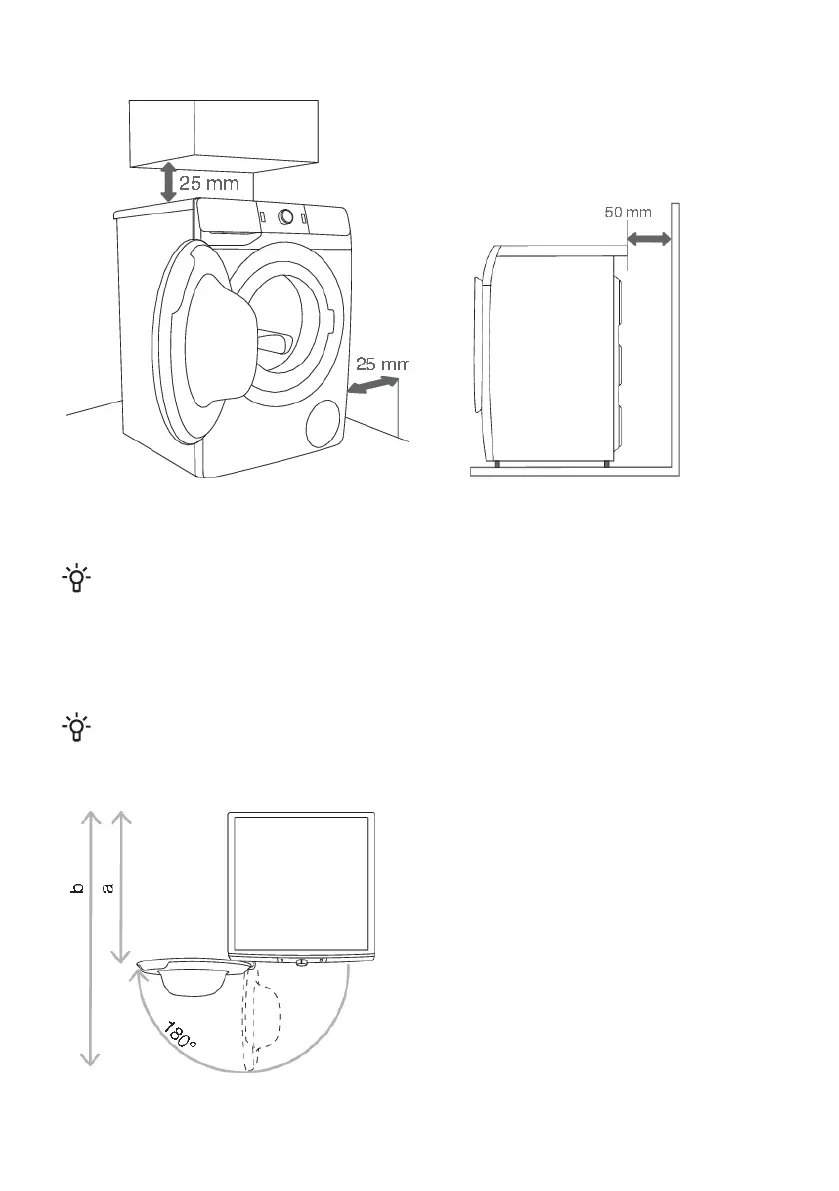 De wasmachine mag de muur of aangrenzende elementen niet raken. Voor een optimale werking