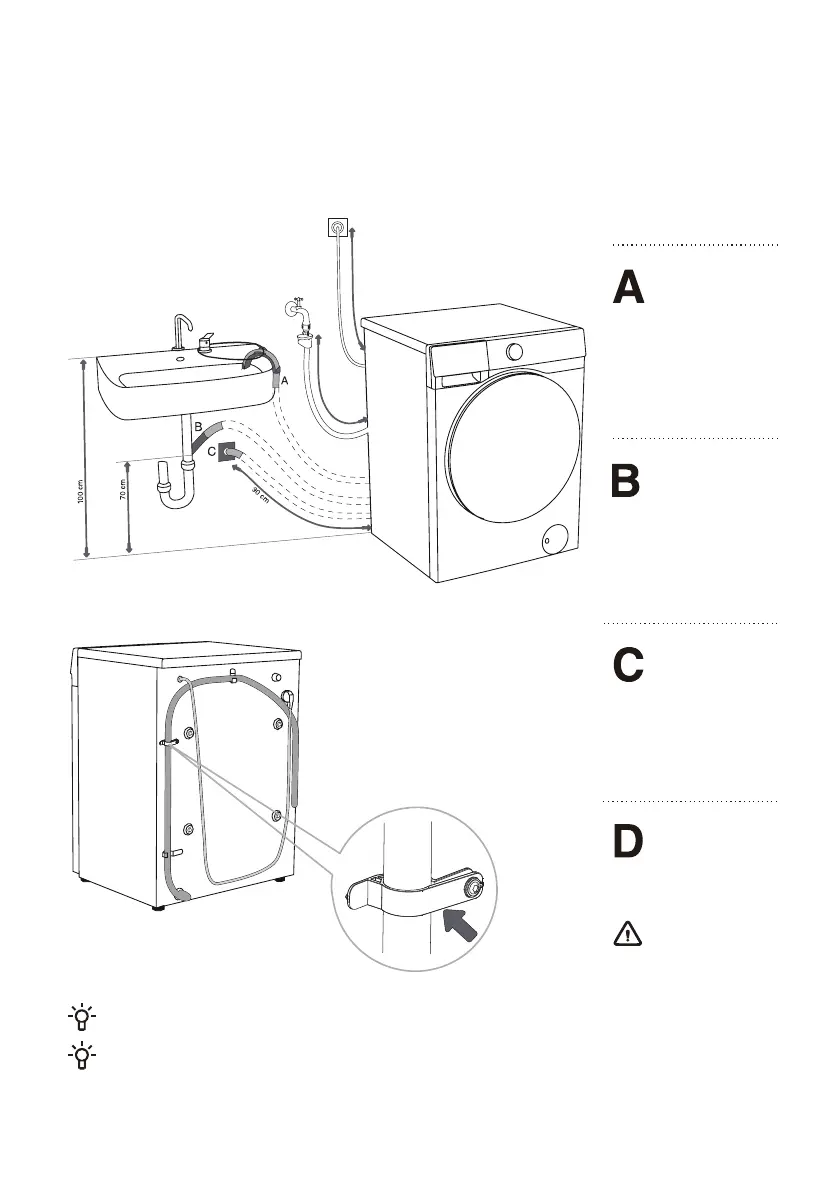 discharge hose may be 70 to 100 cm. lt can be attached in three ways (A, B, C).