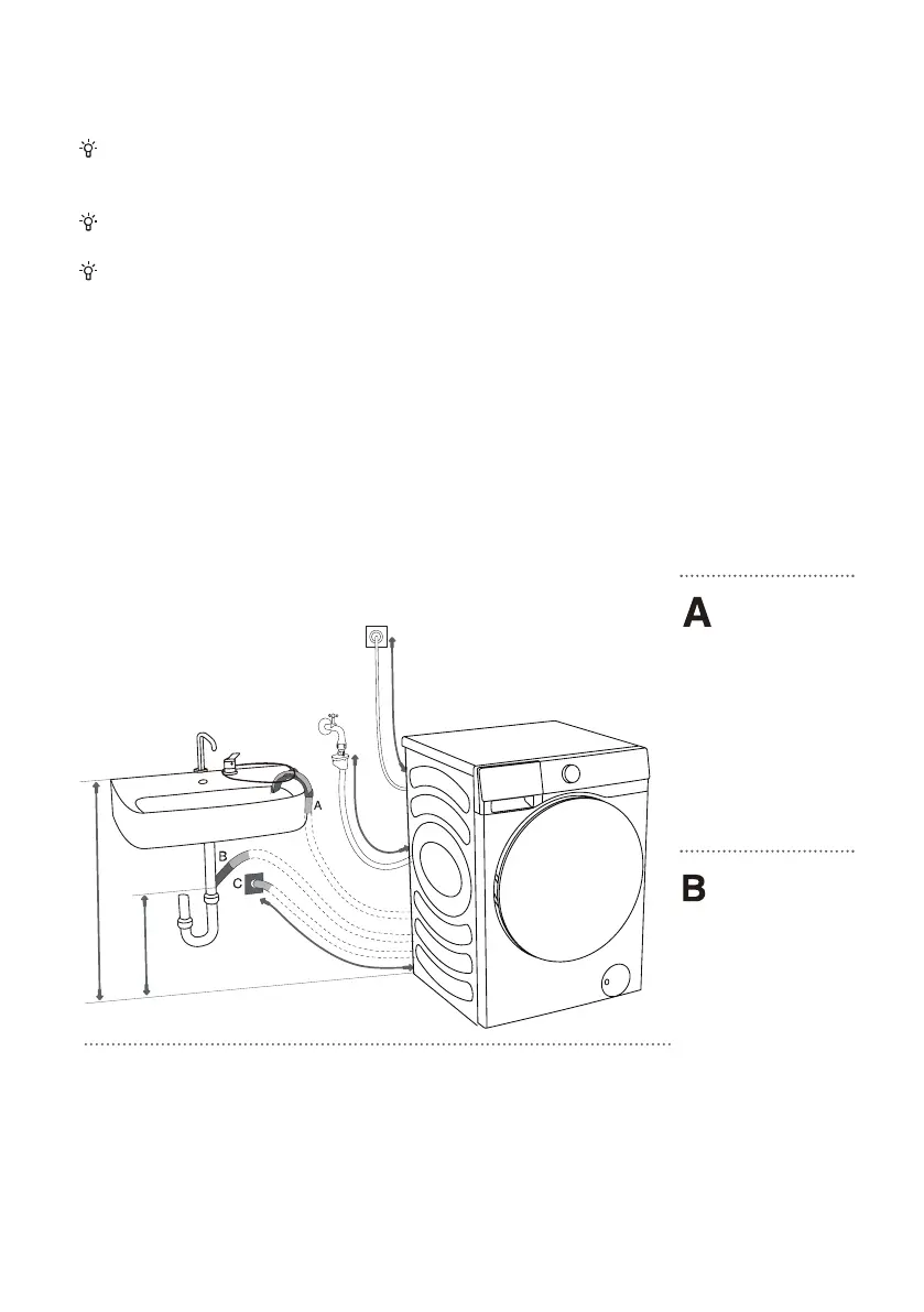 afvoerslang moet 60-100 cm zijn. De slang kan op drie manieren aangesloten worden (A, B, C).