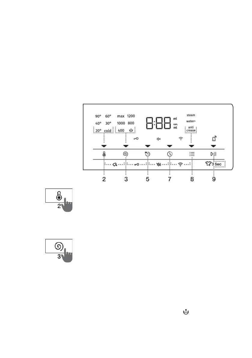 worden gewijzigd door op de positie (2) TEMP. (WASTEMPERATUUR).