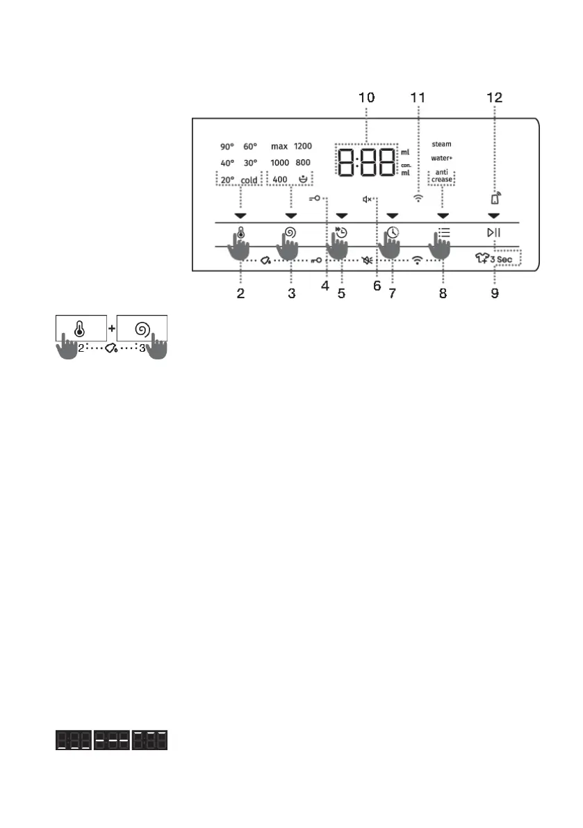 Positionen (2) TEMP. (WASTEMPERATUUR) und (3) SPIN