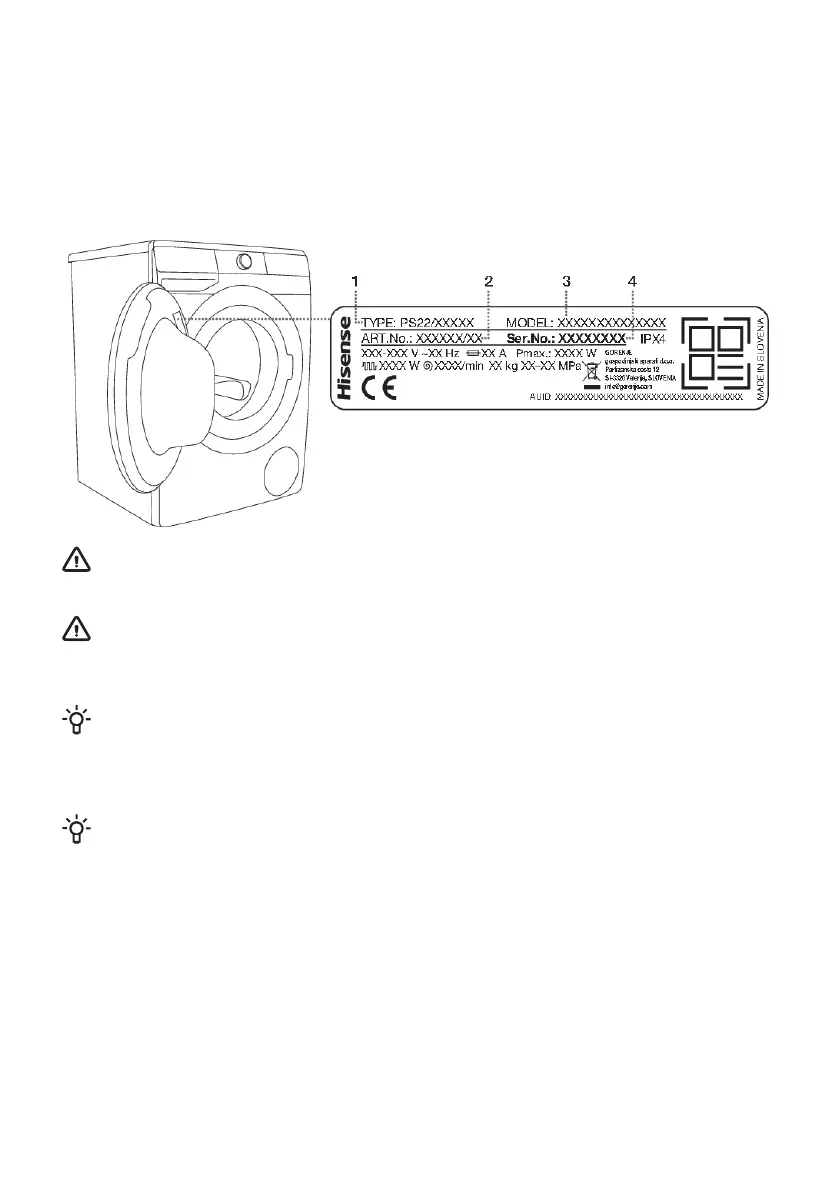 modelnummer (3) en serienummer (4) van uw wasmachine.