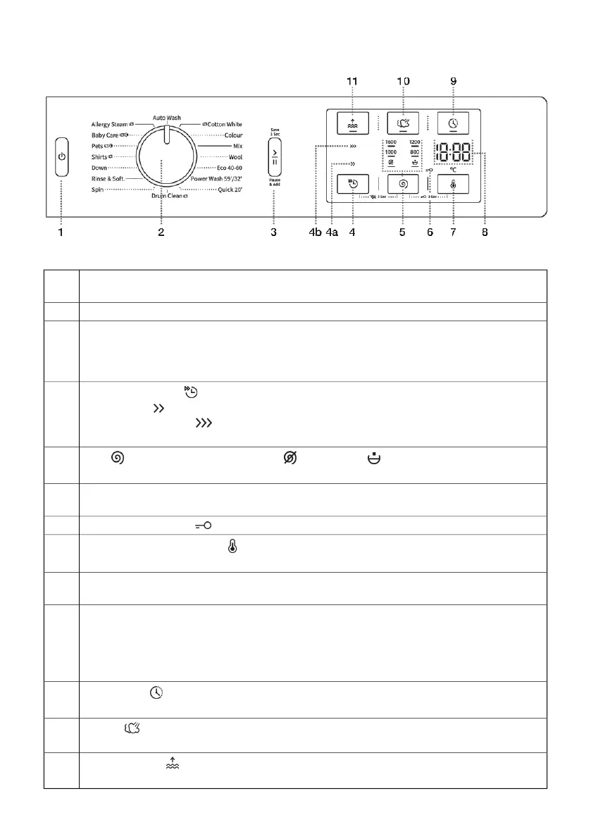 Use this button to turn the washing machine on and off, and to reset the washing programme.