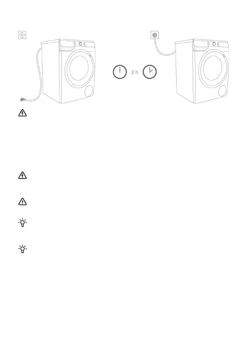Before connecting the washing machine to the power mains, wait for at least 2 hours until