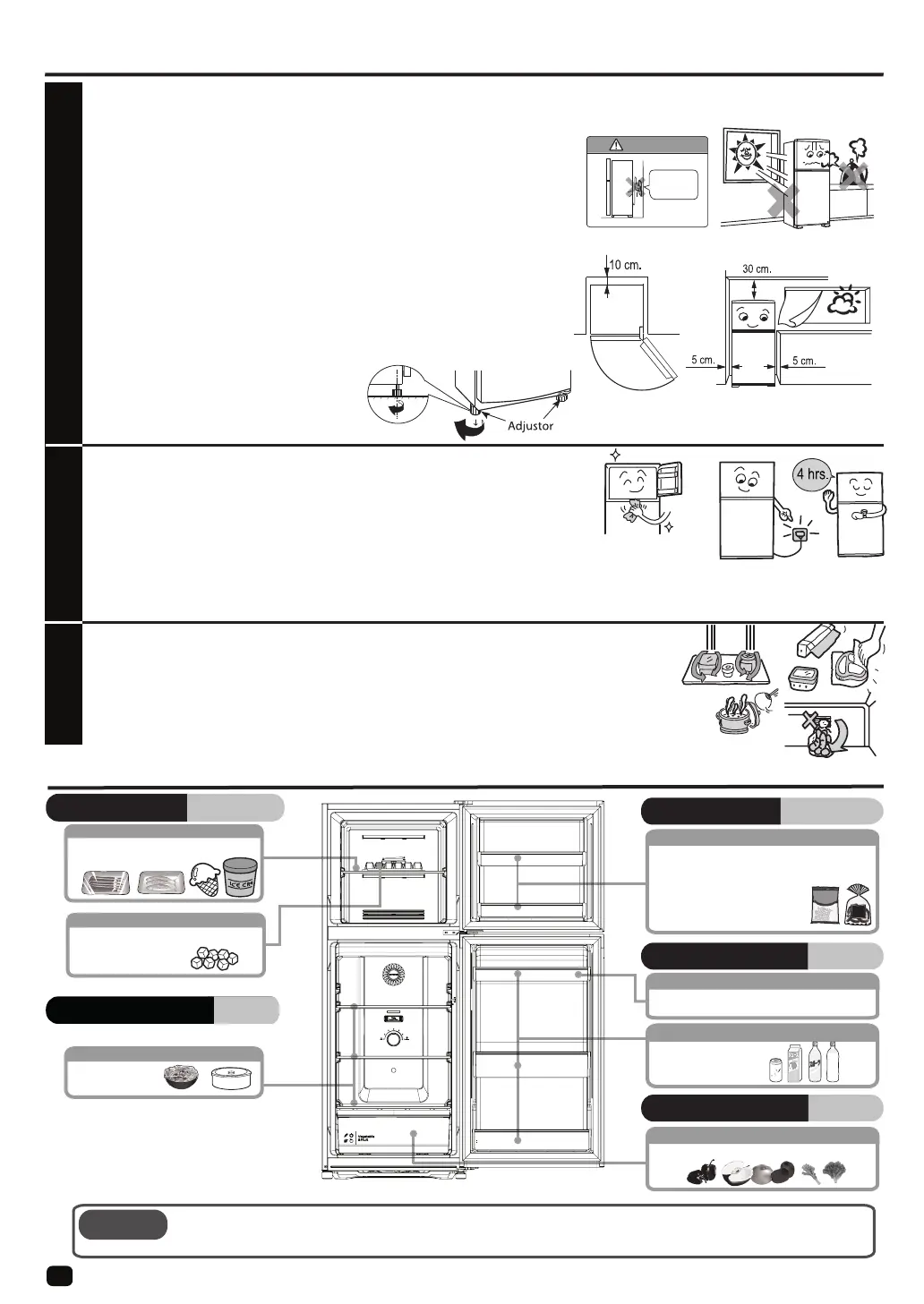 3) Do not install where the refrigerator is exposed to direct sunlight or other heat source.