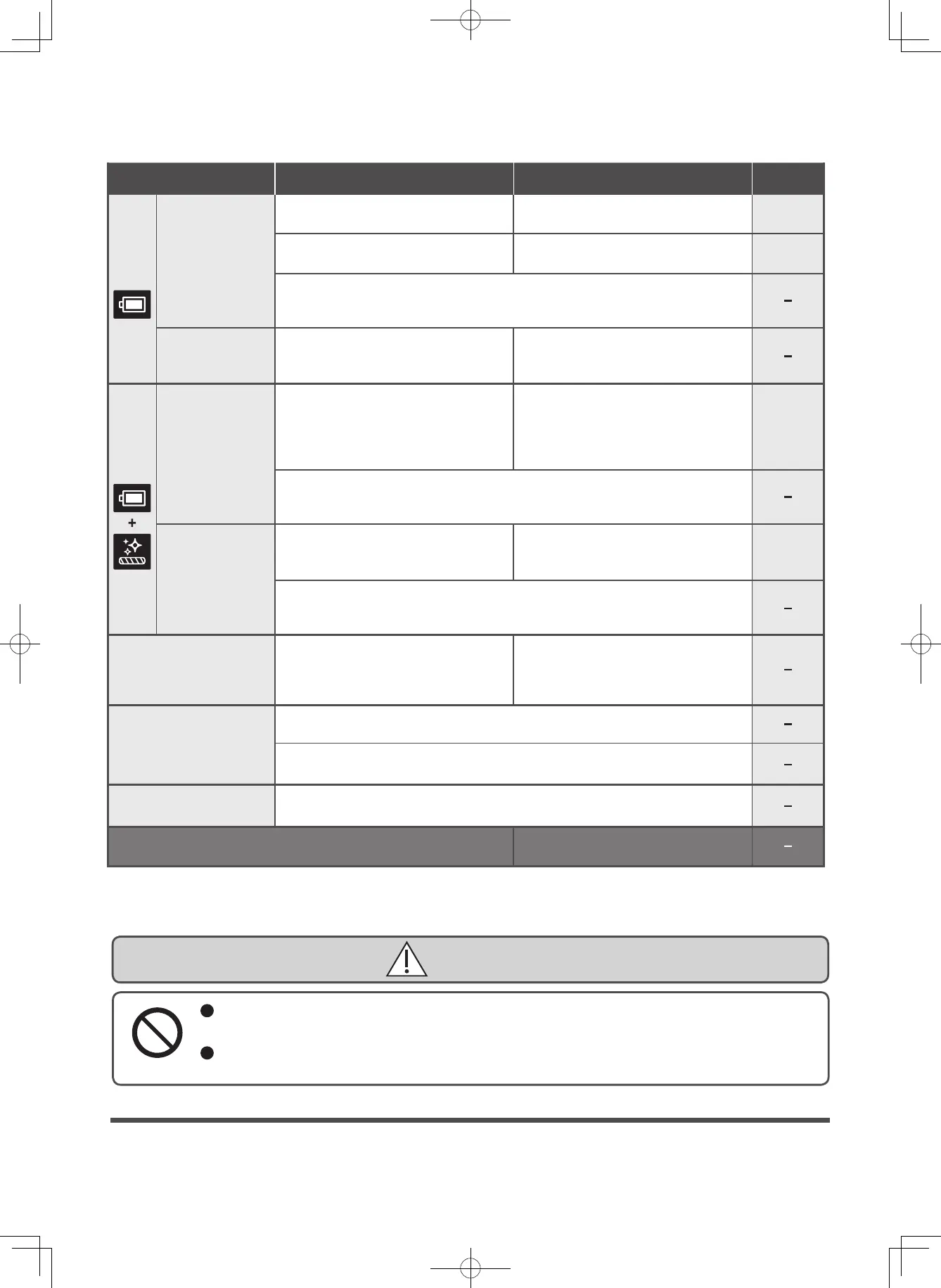 Failure to heed this warning might cause the battery to leak, generate heat, rupture, smoke, fire, electric shock, or injury.