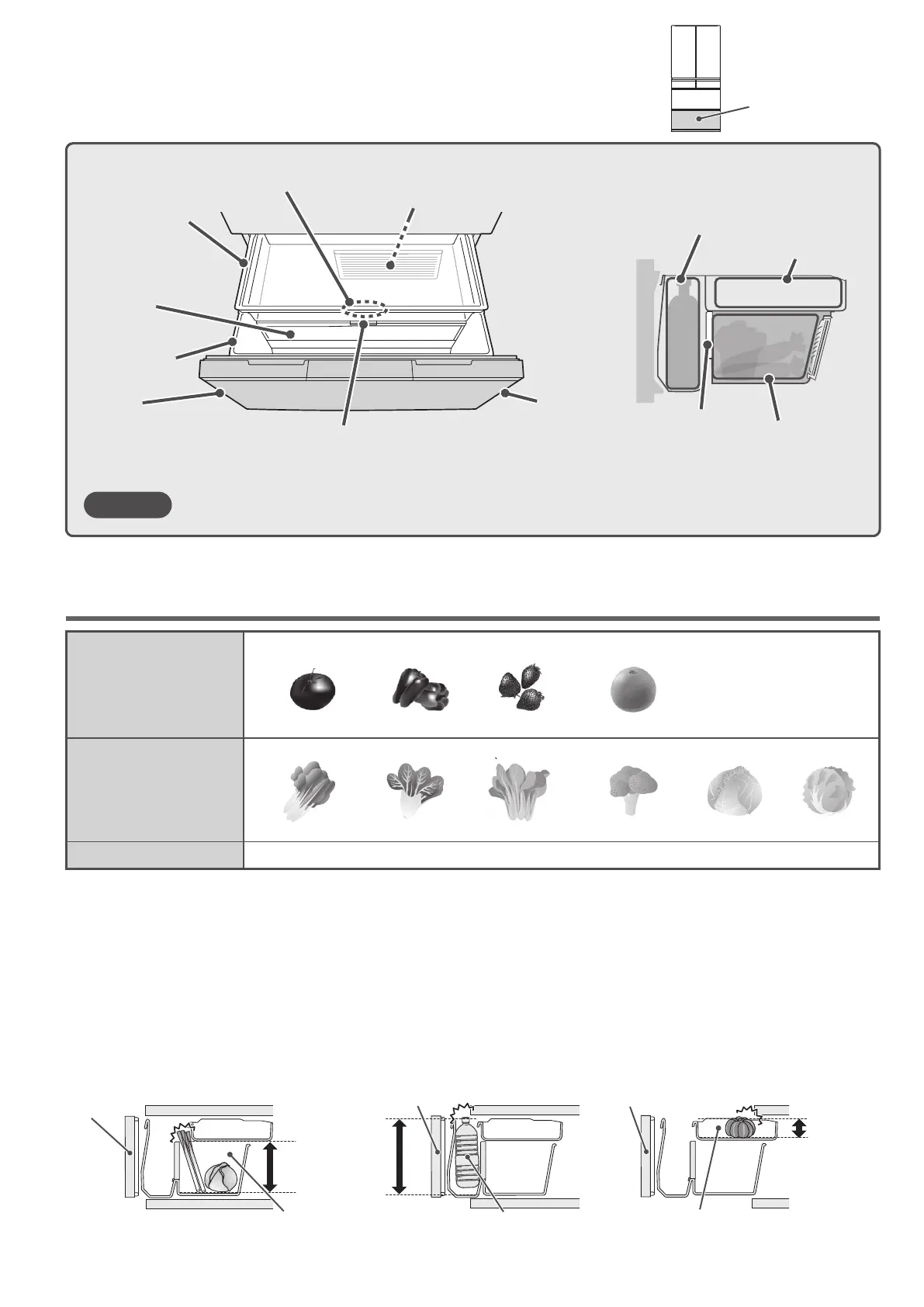 ・The doors may not close properly and the refrigerator may not cool properly. The food or the cases may also be damaged.