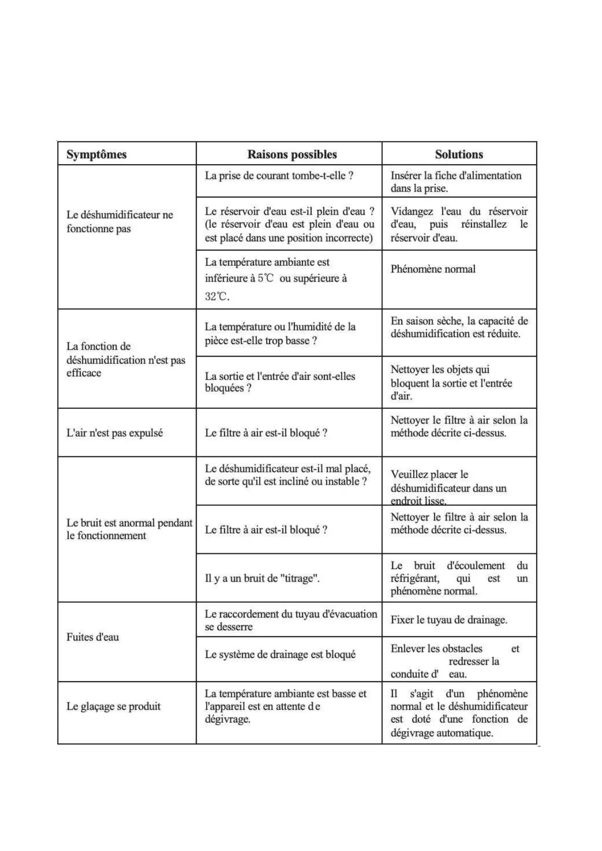Si les problèmes suivants surviennent avec le déshumidificateur, les solutions