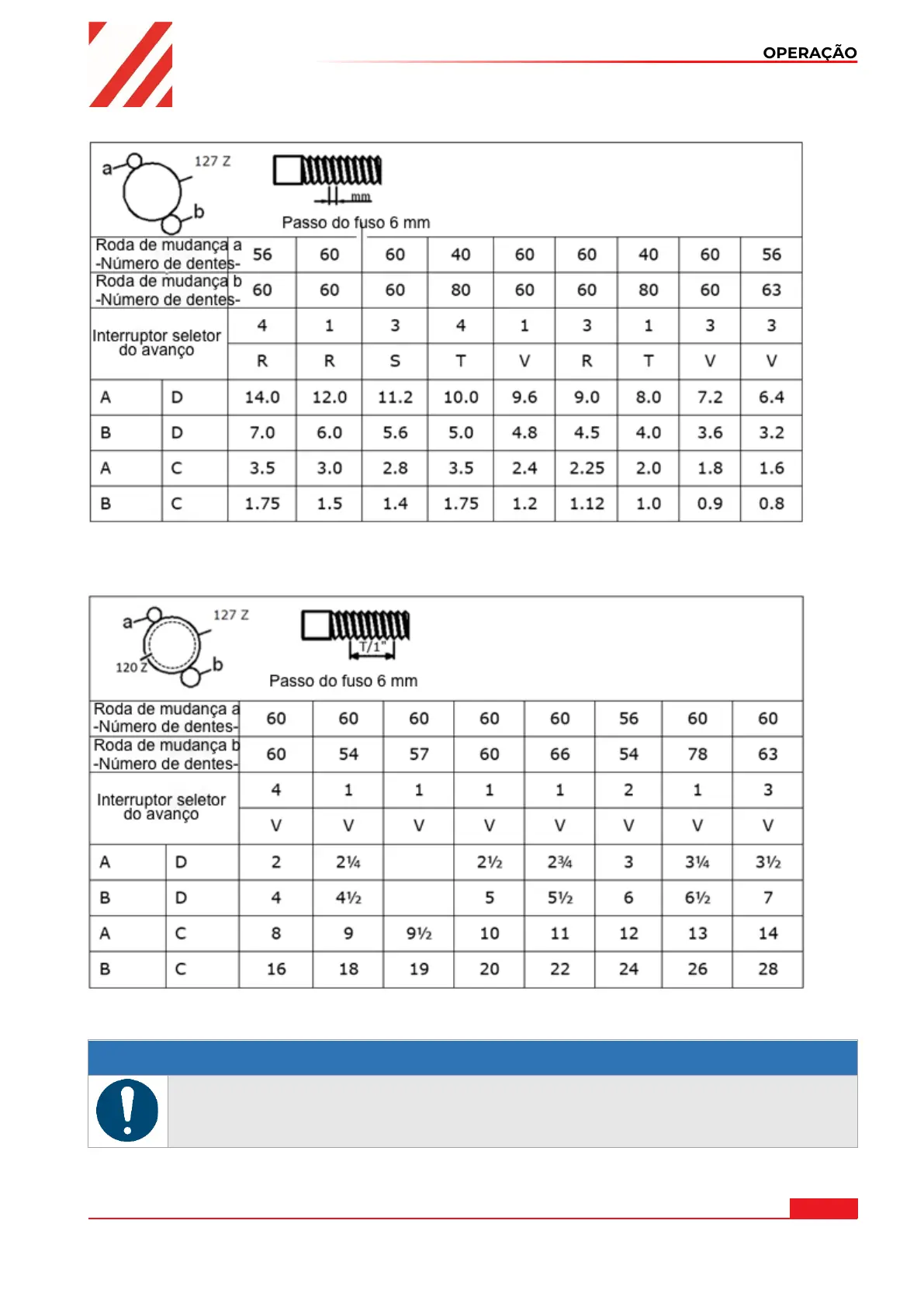 38.5.6 Tabela de passo de rosca / avanço longitudinal para roscas de polegadas