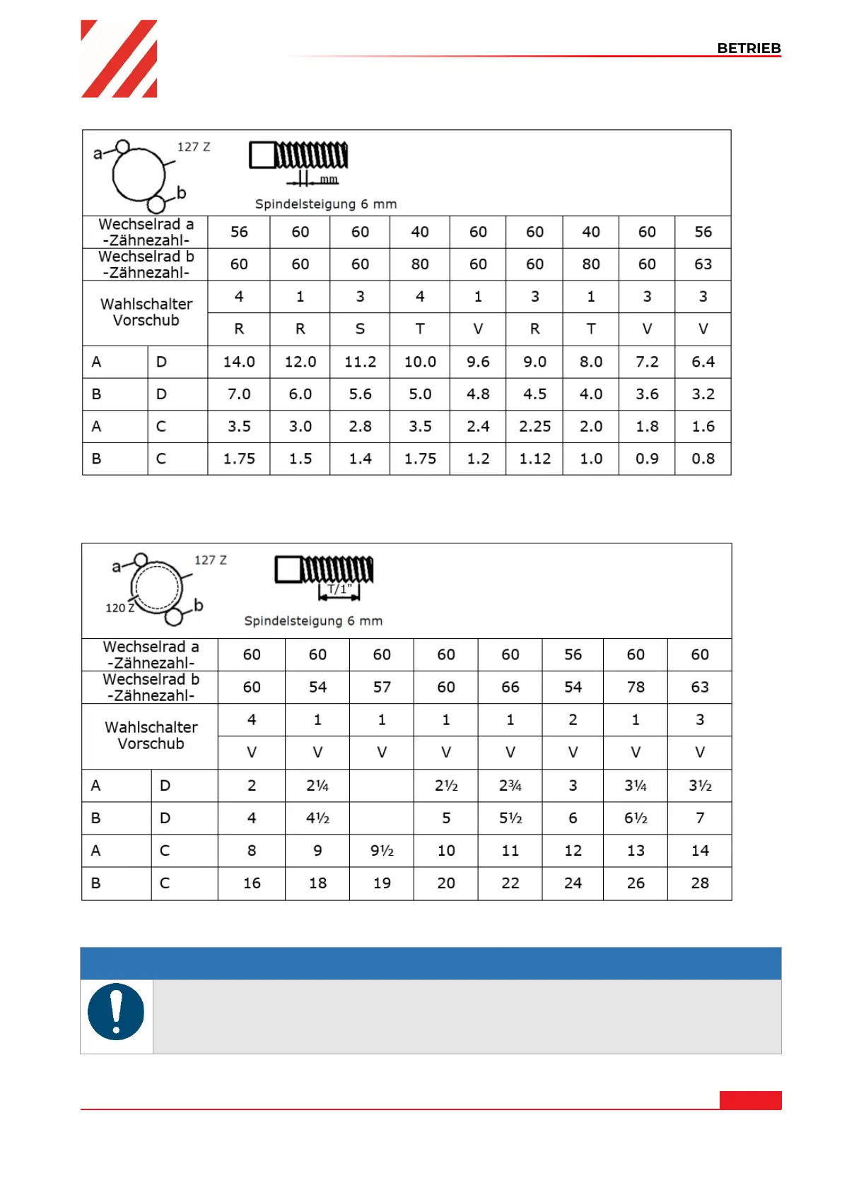 8.5.6 Gewindesteigungstabelle / Längsvorschub für Zoll-Gewinde