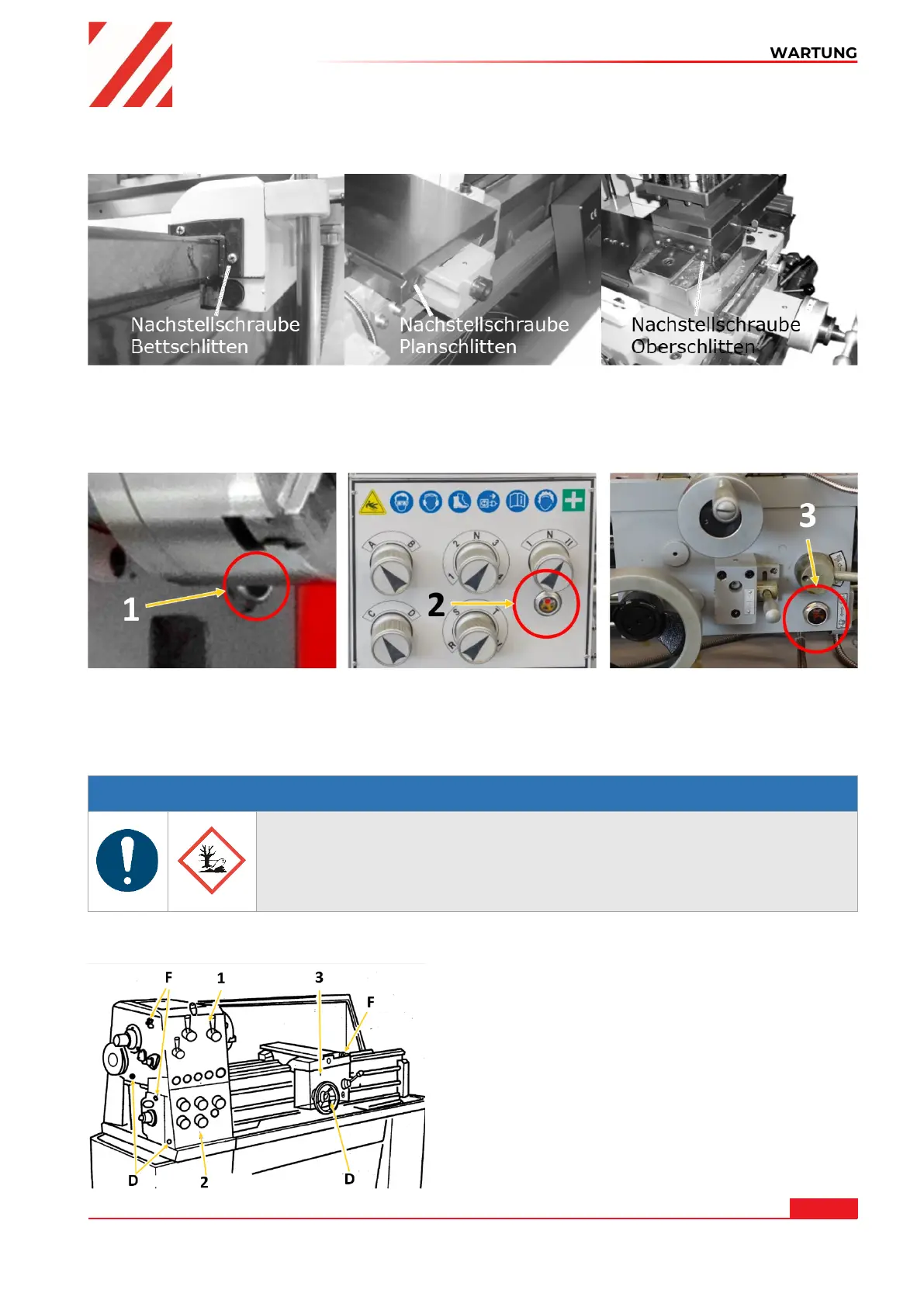 Ölstände von Spindelstock (1), Vorschubgetriebe (2) und Schlosskasten (3). Der Ölstand muss