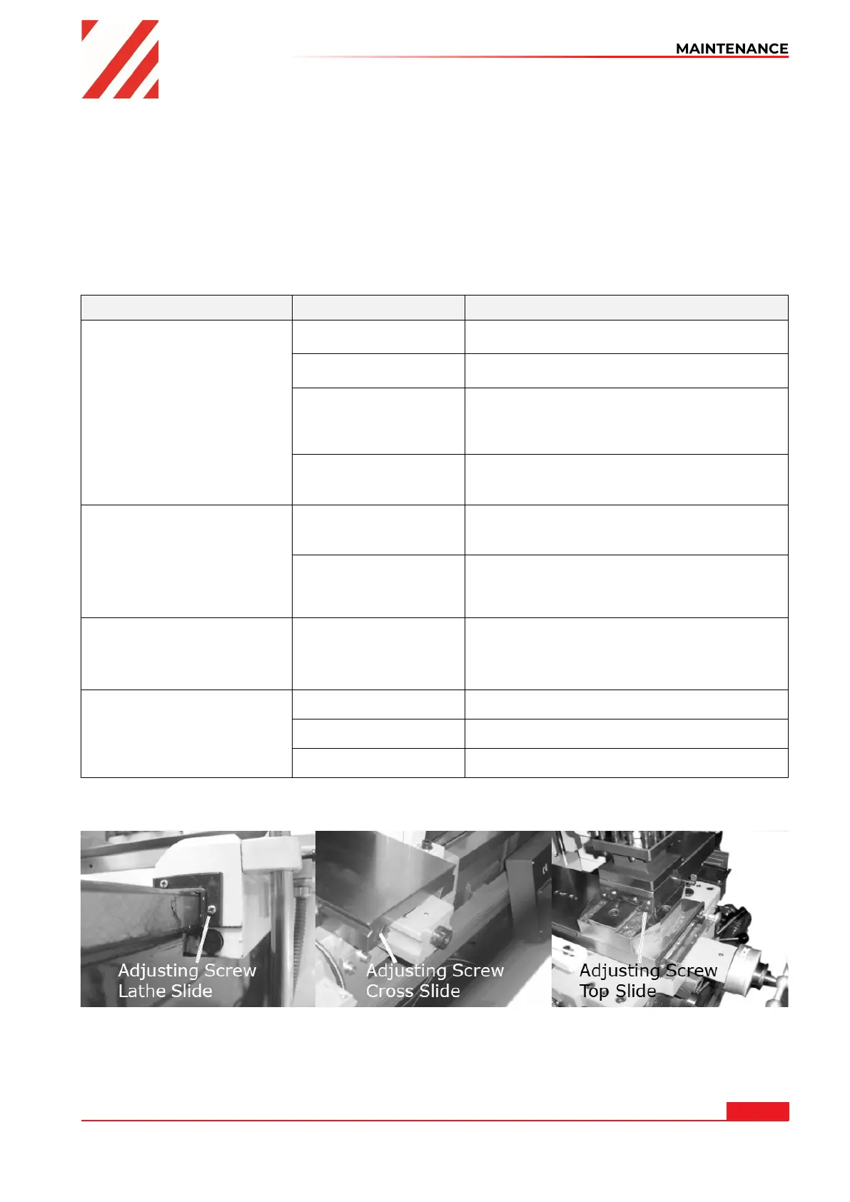 adjustment screw clockwise. This pushes the taper gibs backwards and reduces the clearance of