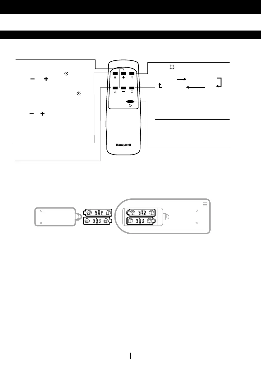 Battery Installation: Remove the cover on the back of the remote control and insert two AAA