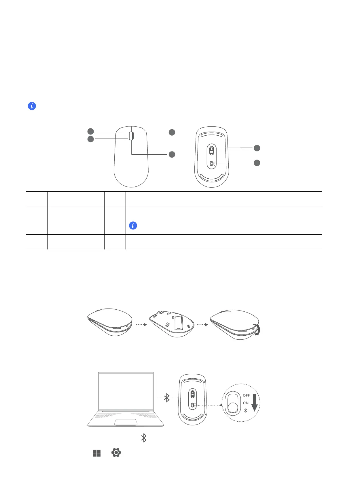 1 按照图示将蓝牙鼠标底部开关拨至 处并保持 3 秒,指示灯闪烁后松开,鼠标进入配对状态。