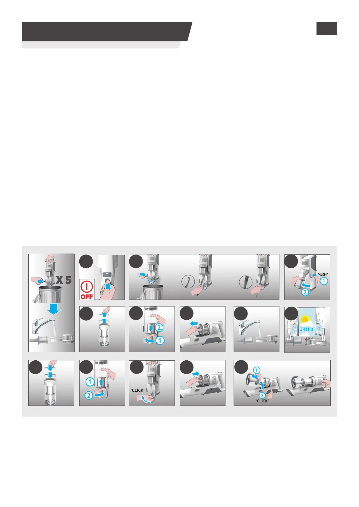 10.Remontez le ltre en métal dans le bac à poussière, insérez-le en position et tournez-le dans le sens