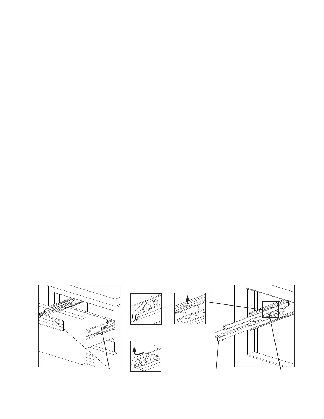 • To remove a drawer slide (center slide containing rollers): Push up on the stop