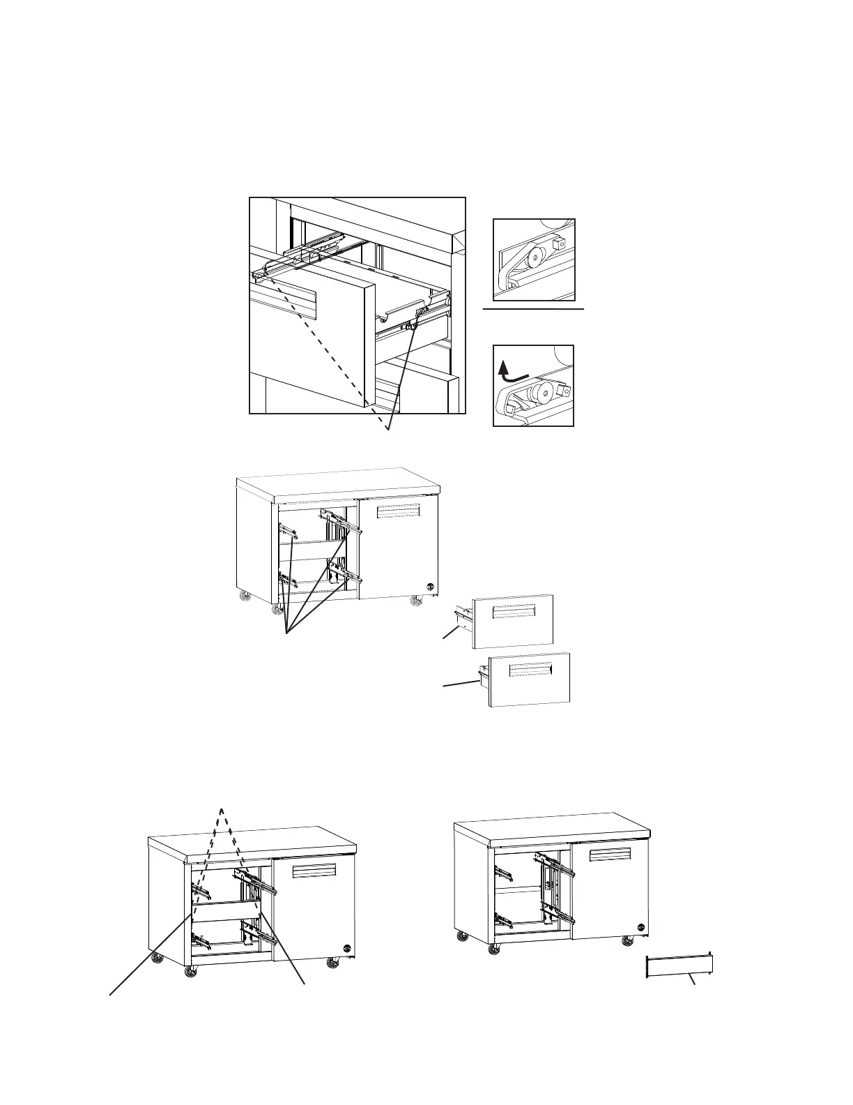 2) Remove the drawers. Pull the drawer out to its fully extended position. Open the safety