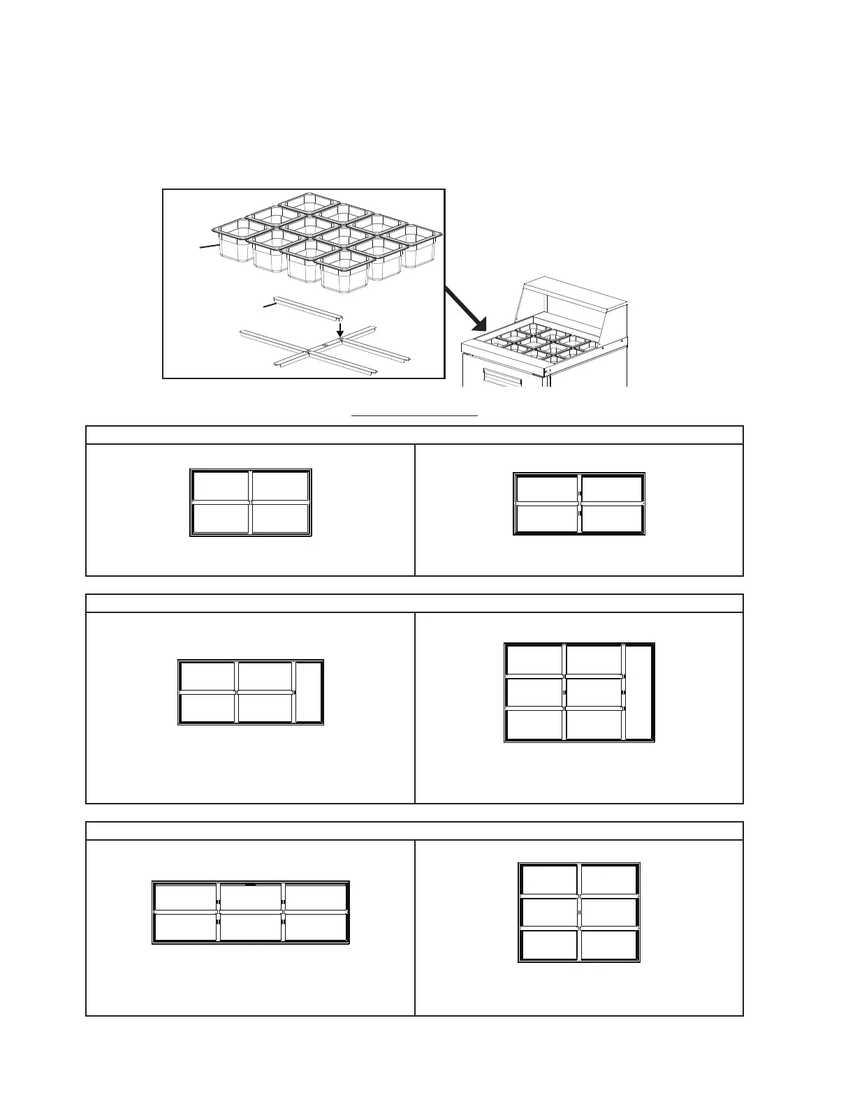 Install the rail dividers and 1/6 size pans included with the appliance. See Fig. 7 and the