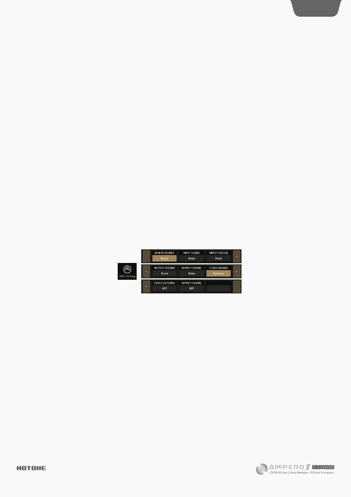 This menu allows you to set up Ampero II Stomp’s MIDI input source, MIDI I/O channels, MIDI clock I/O options.