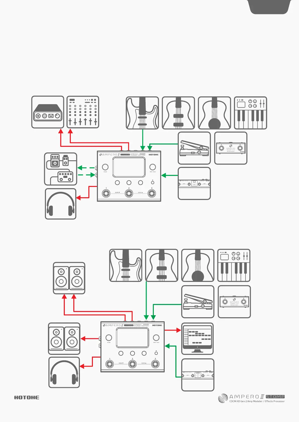 Turn the output volume all the way down before connecting headphones to prevent harm to your ears. Ampero II Stomp’s