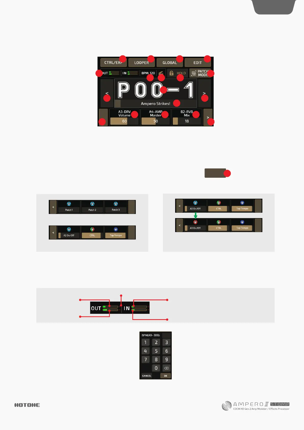 14. Indicates current unit mode; press to switch between PATCH MODE and STOMP MODE (see Unit Mode section on )page 10