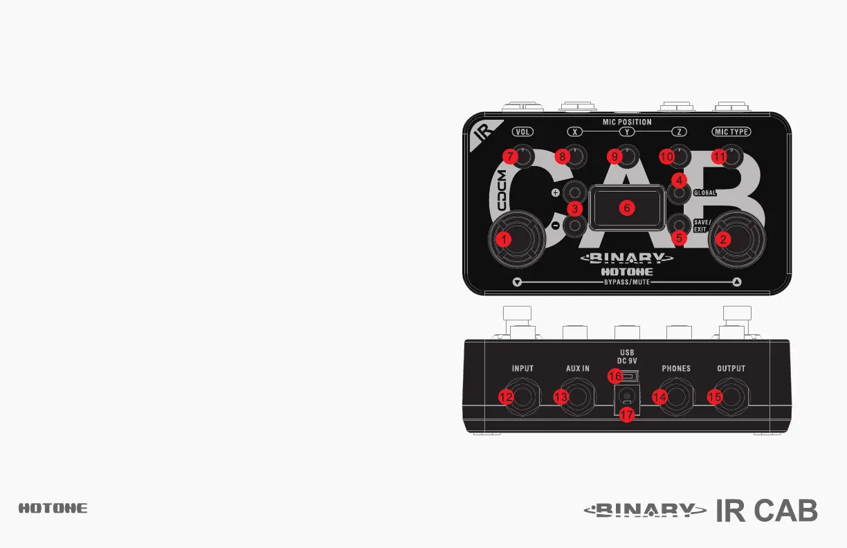 15. OUTPUT: 1/4” (6.35mm) mono jack, for connecting to audio interfaces, mixers or