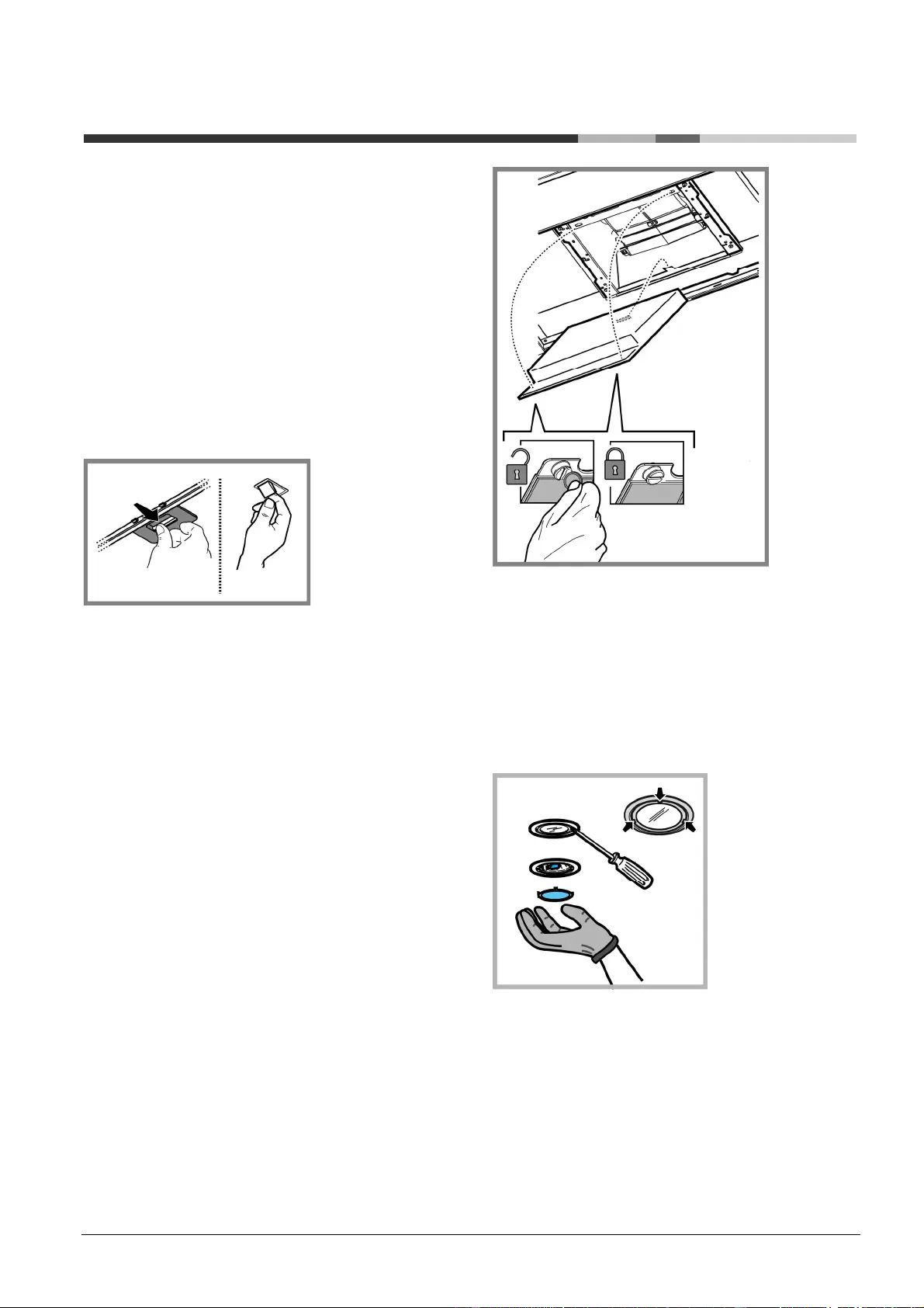 Îndepărtaţi filtrul de cărbune activ rotind 90° mânerele ce îl fixează la hotă.