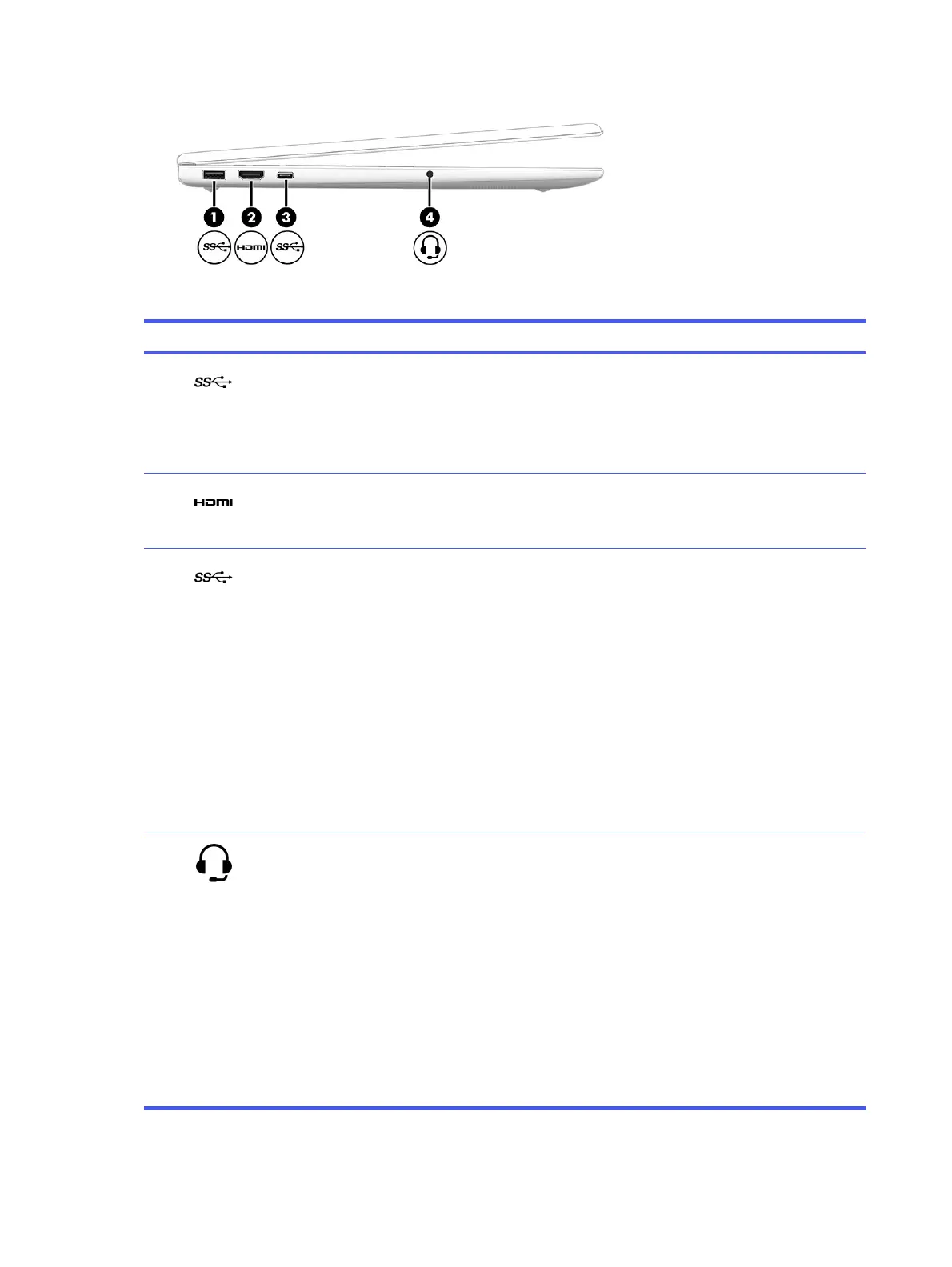 (1) USB 5 Gbps port Connects a USB device, provides high-speed data transfer,
