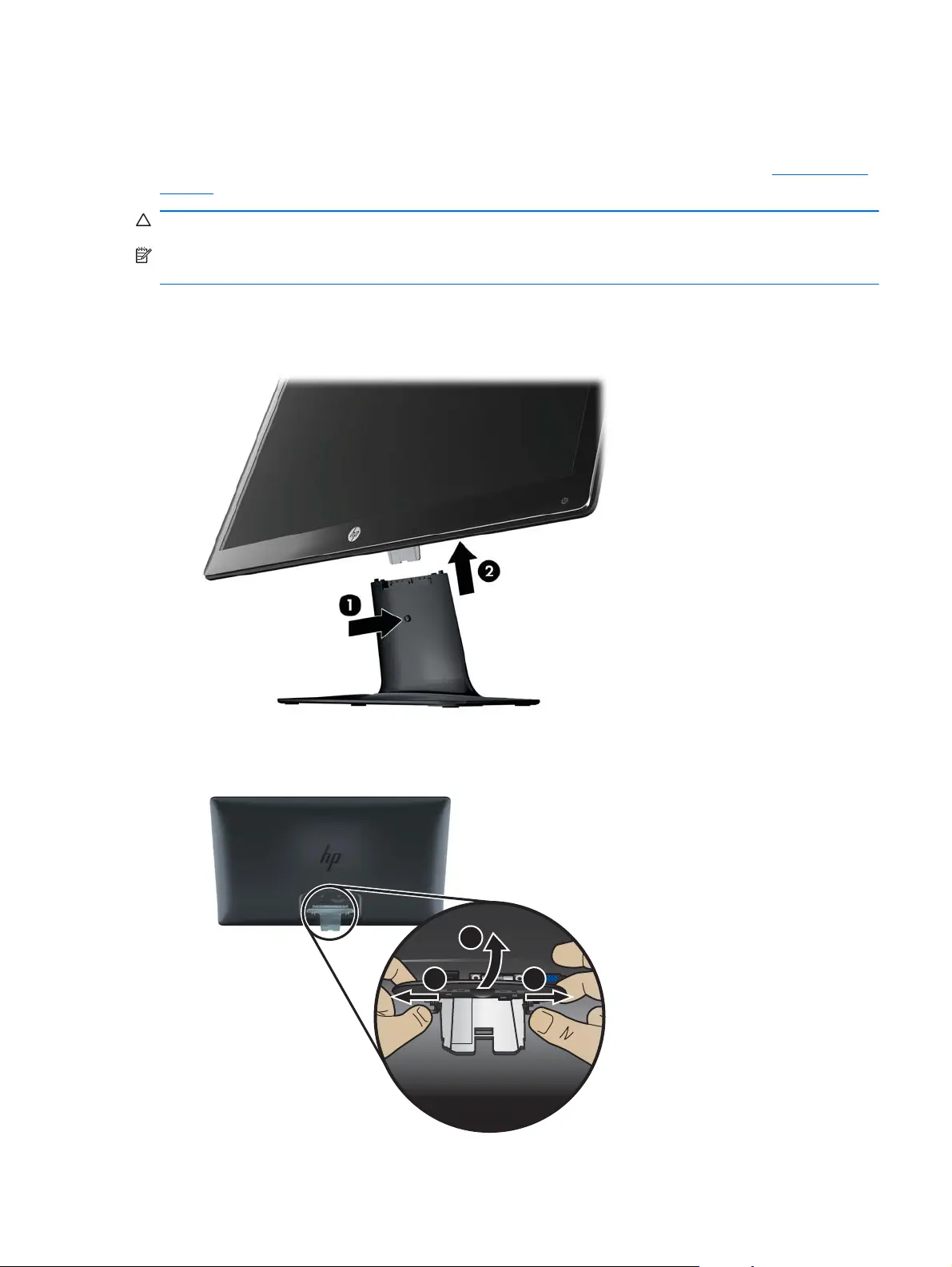 1. If the monitor is installed on the base, press the button on the front of the pedestal and lift the