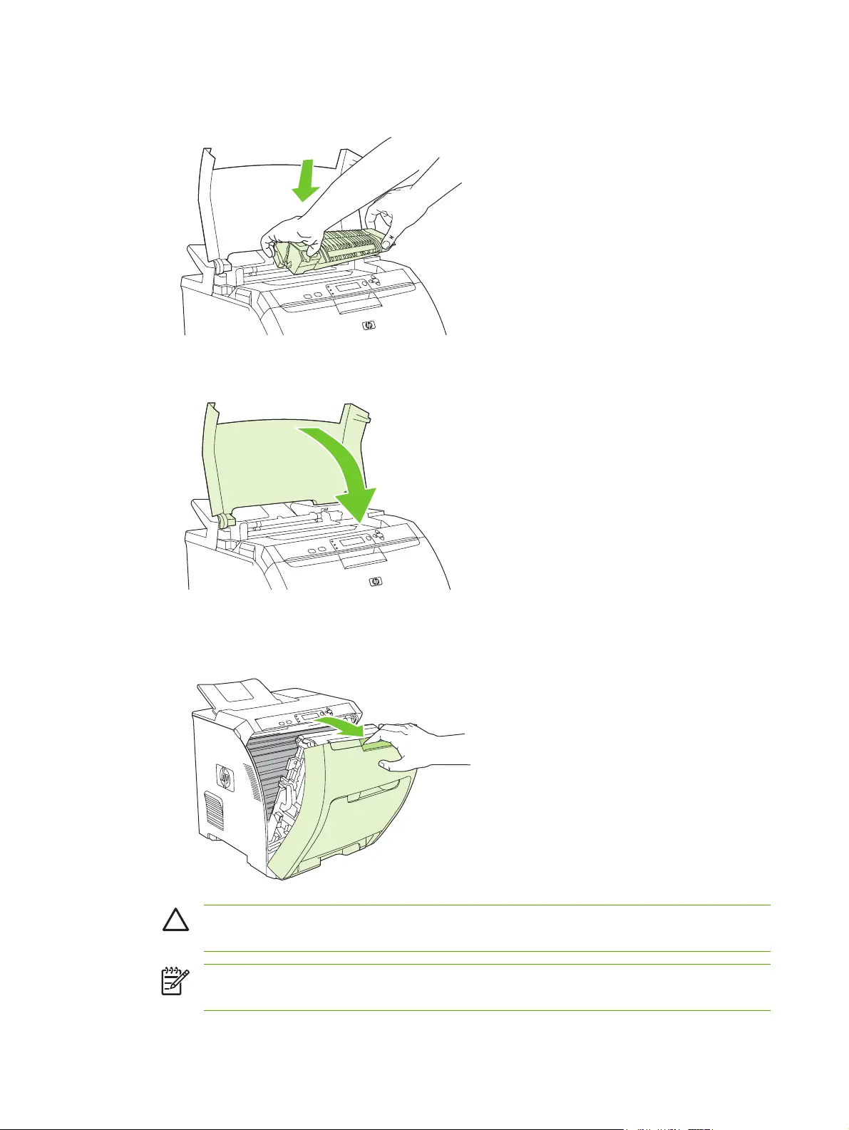 7. Pak de fuser vast met uw duimen op de hendels en duw vervolgens beide kanten van de fuser in