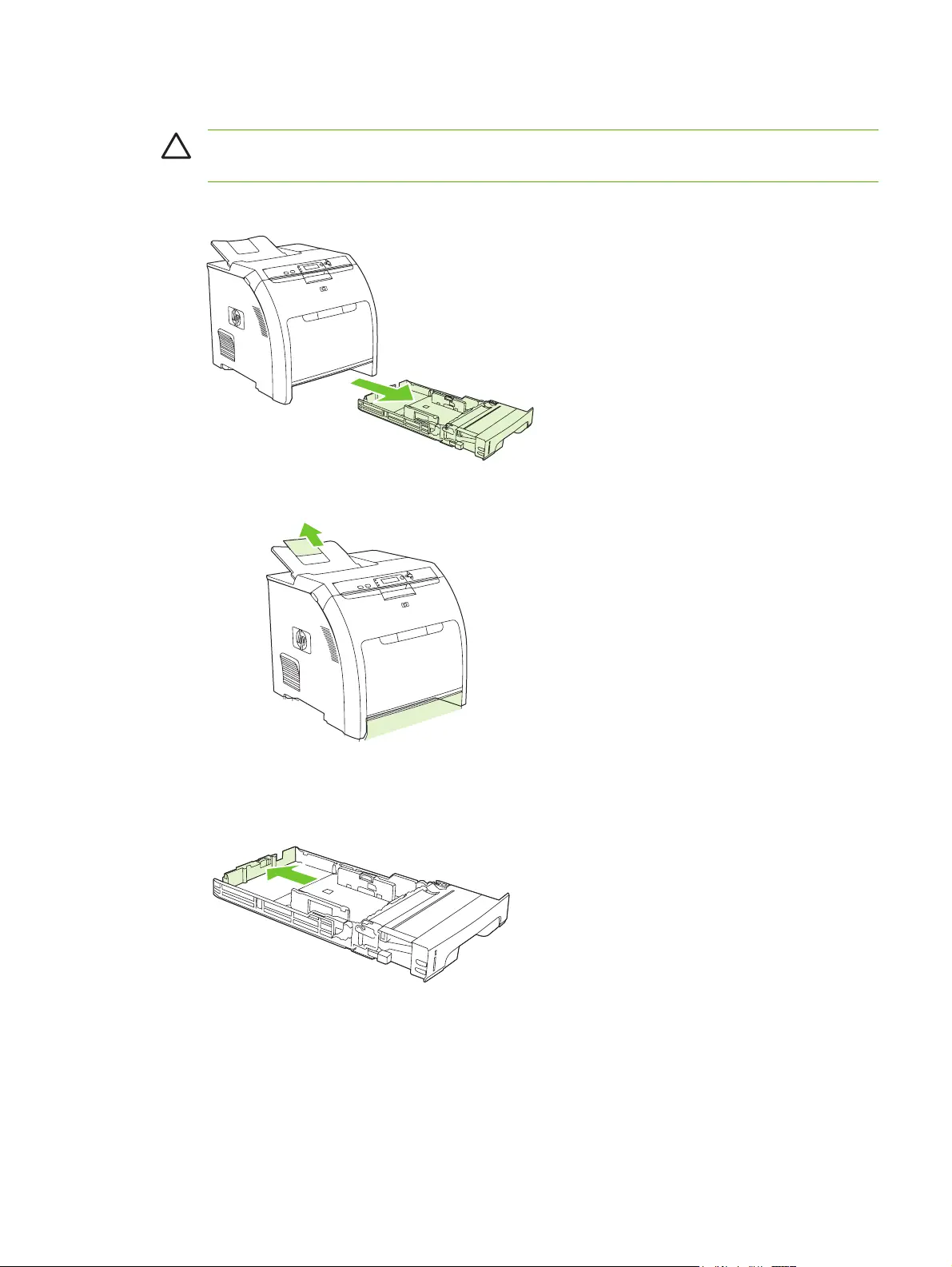 VOORZICHTIG Als u papierstoringen wilt vermijden, moet u geen lade openen of verwijderen