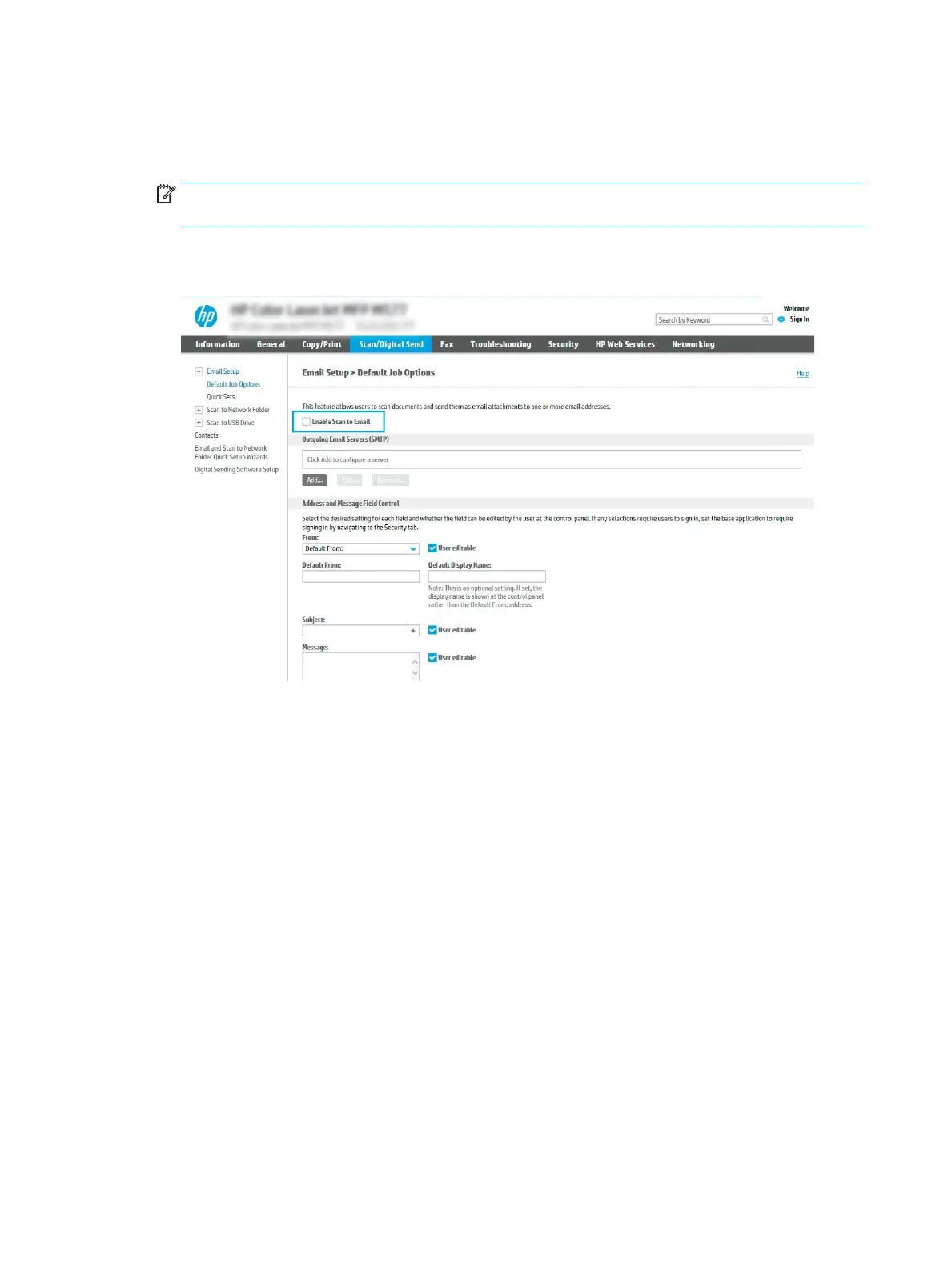 1. Using the EWS top navigation tabs, click Scan/Digital Send, and then click Email Setup in the left navigation