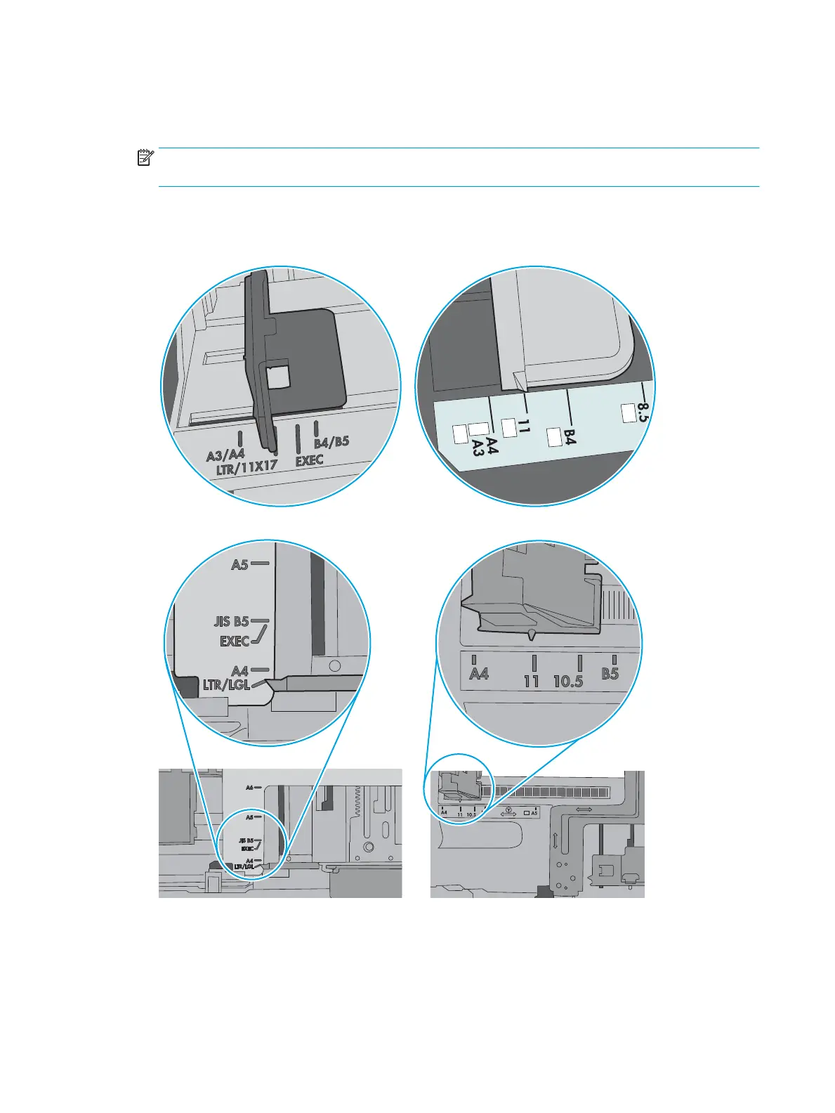 The following images show examples of the paper-size indentations in the trays for various printers. Most