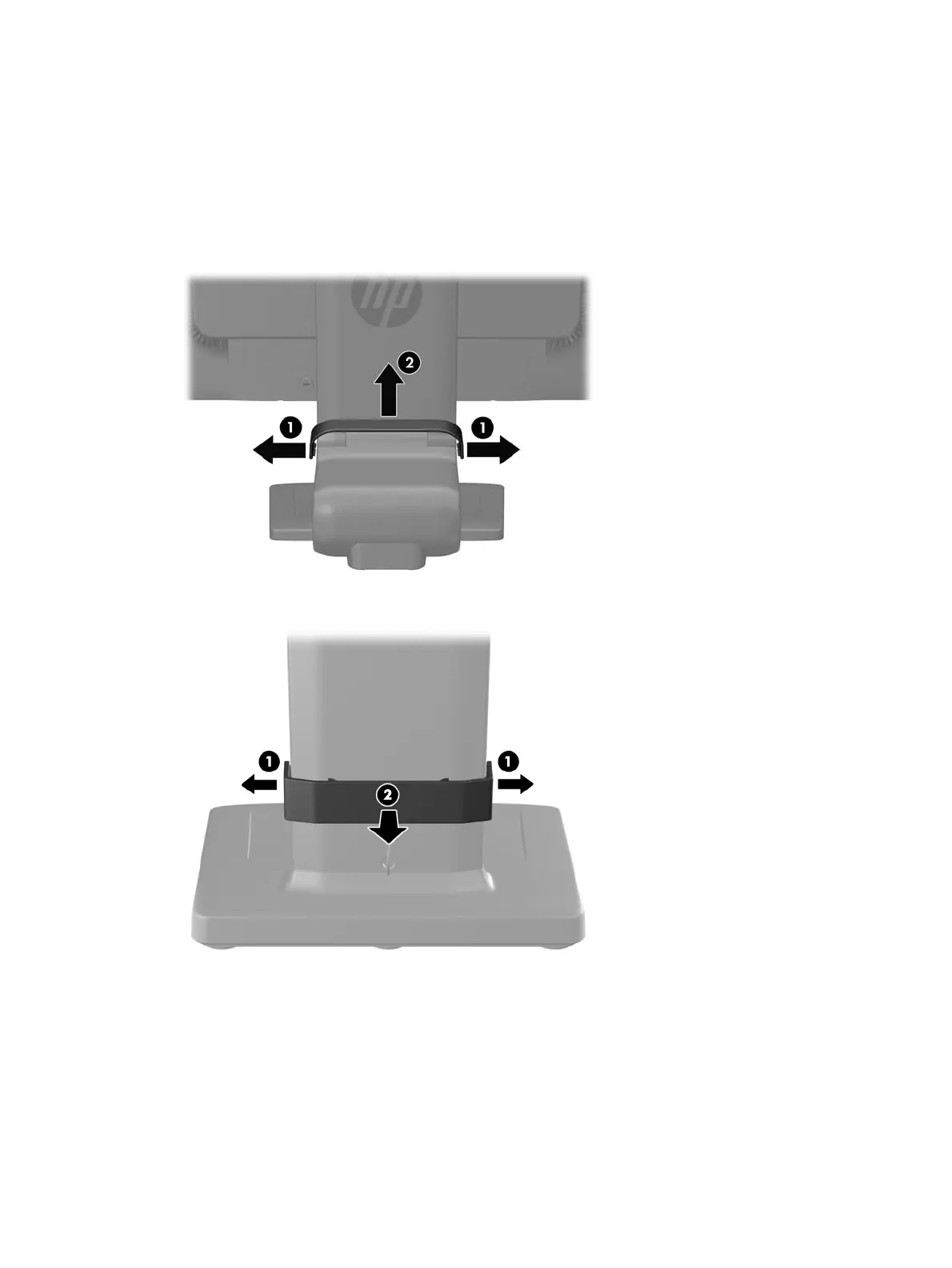 2. Verwijder de kabelklem van de voet door de zijkanten van de klem naar buiten te trekken (1) en