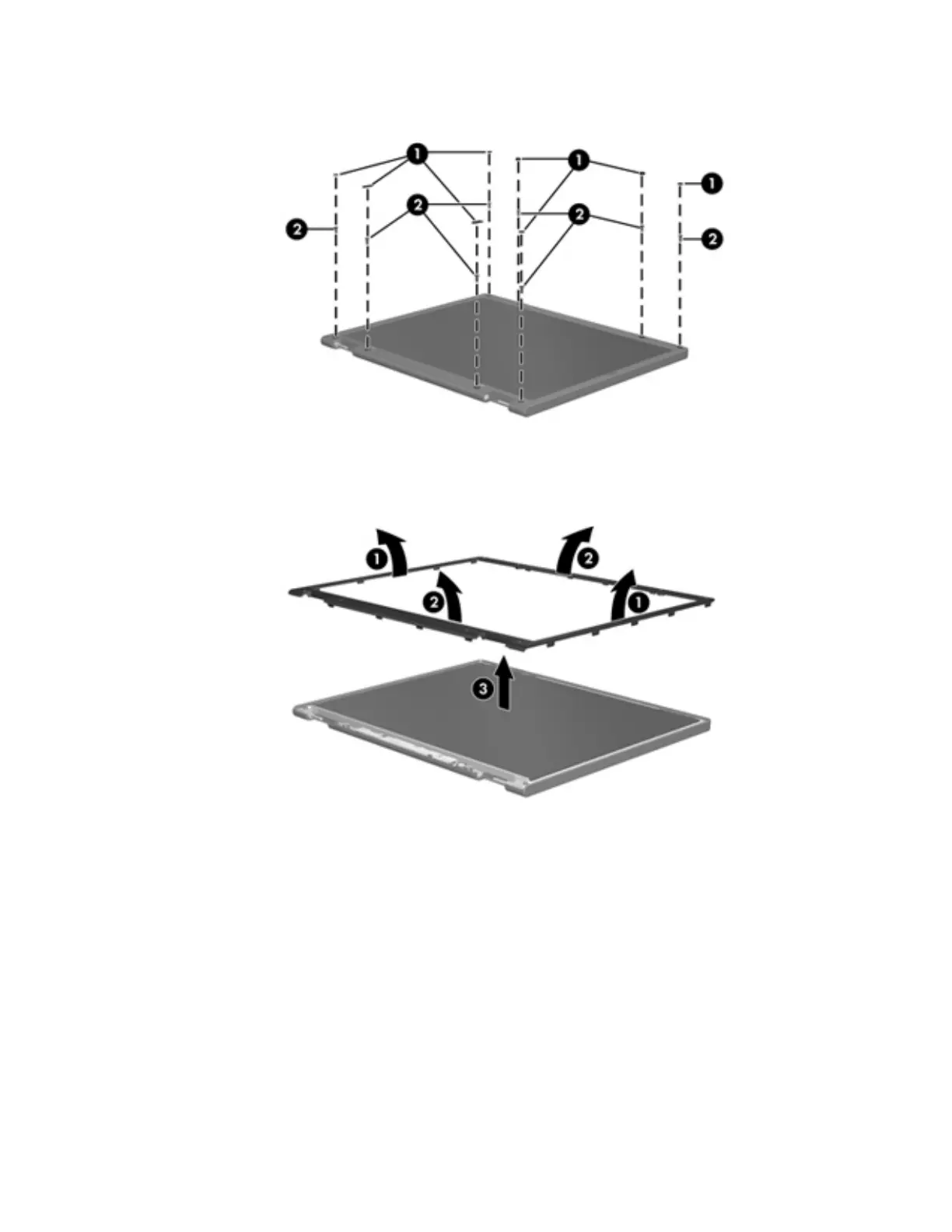 1. Remove all screw covers 1 and screws 2 that secure the display bezel to the display assembly.