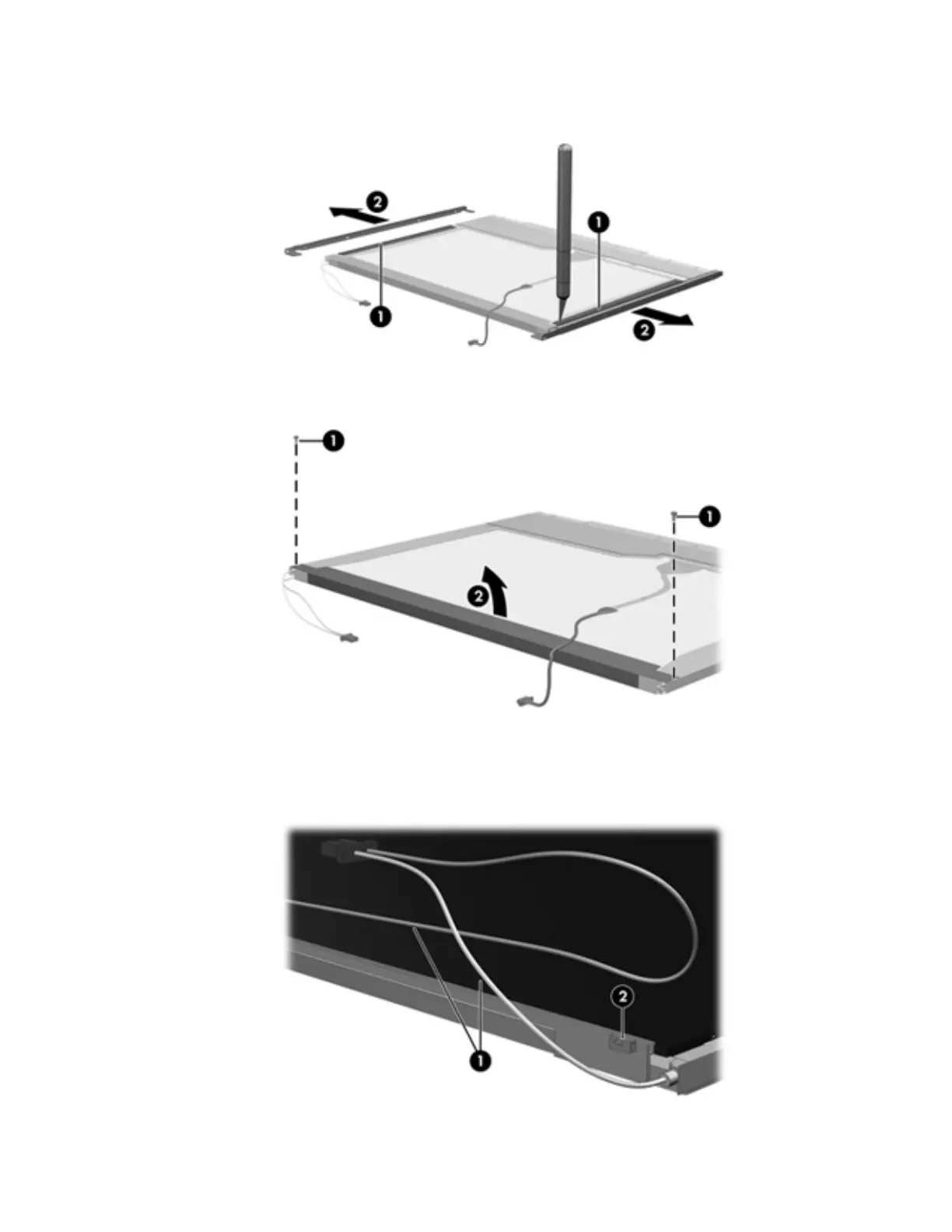11. Remove the screws 1 that secure the backlight cover to the display panel.