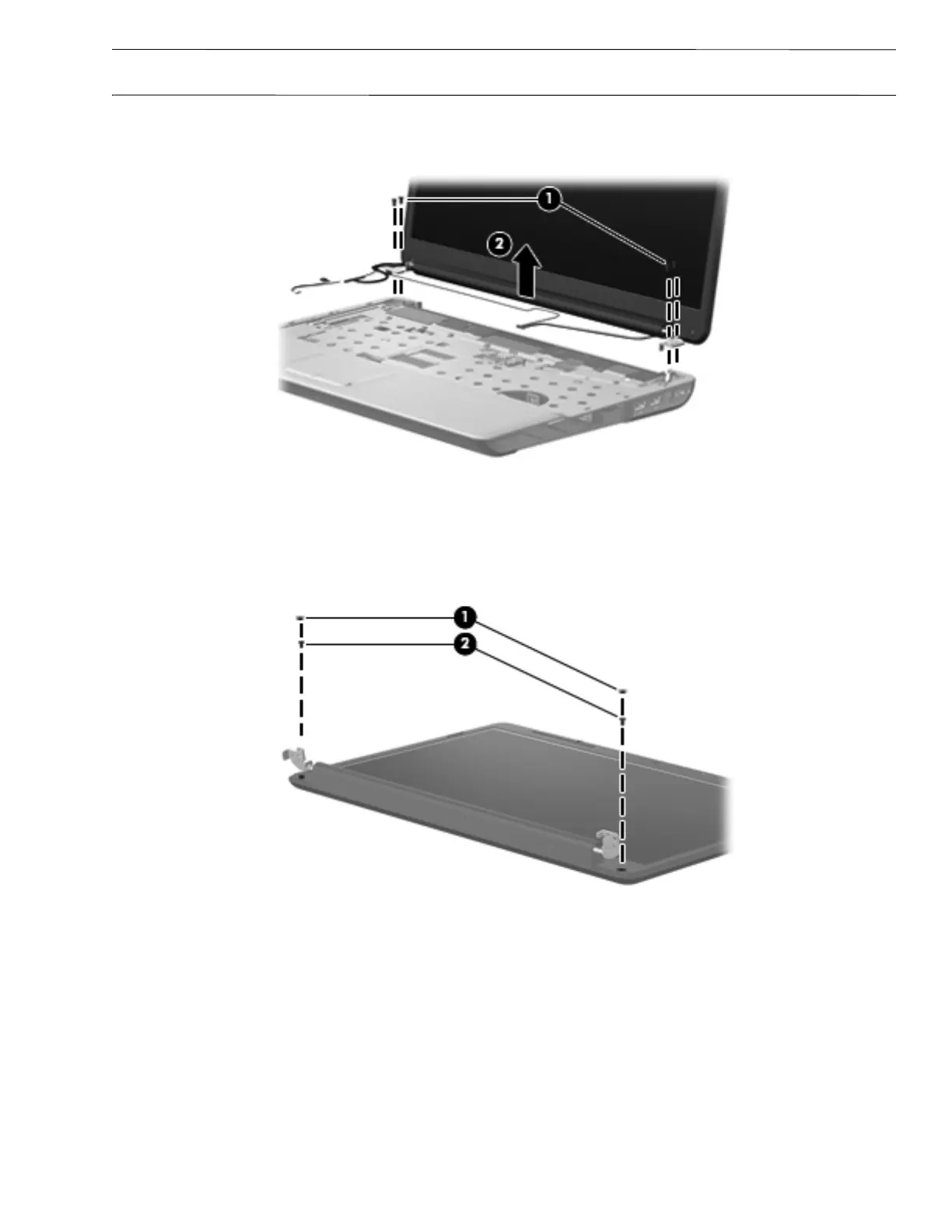 5. Remove the four Phillips PM2.5x9.0 screws 1 securing the display hinges to the computer.