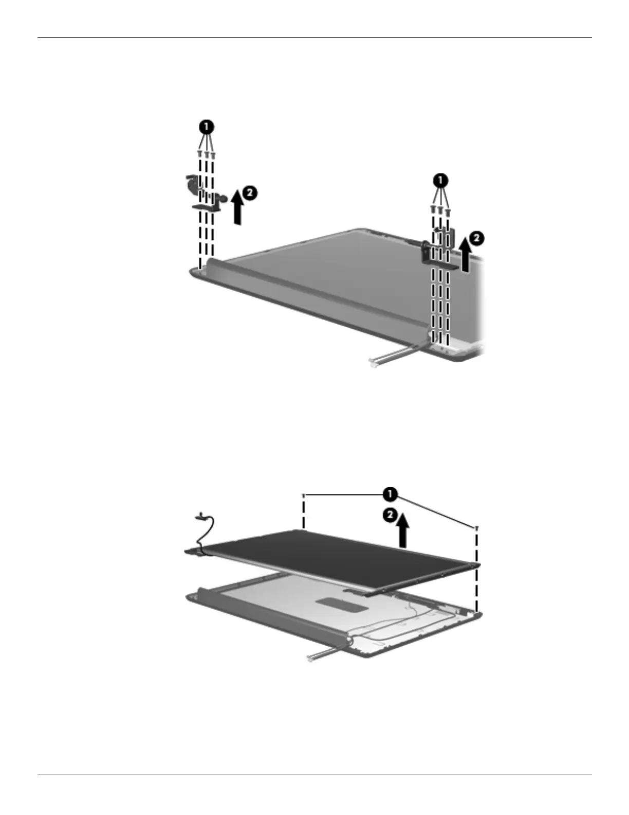 13. Remove the display hinges 2. The display hinges are available in the Display Hinge Kit, spare part number