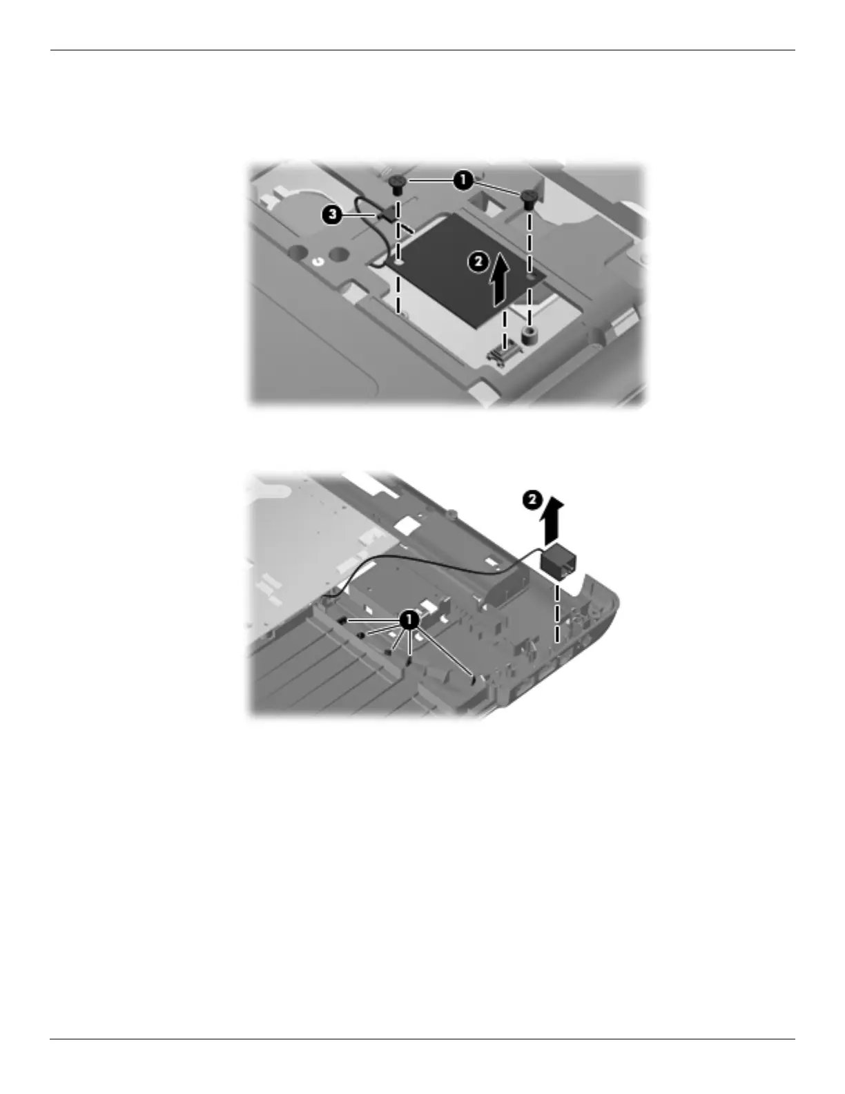 1. Remove the 2 screws 1 that secure the modem to the base enclosure.