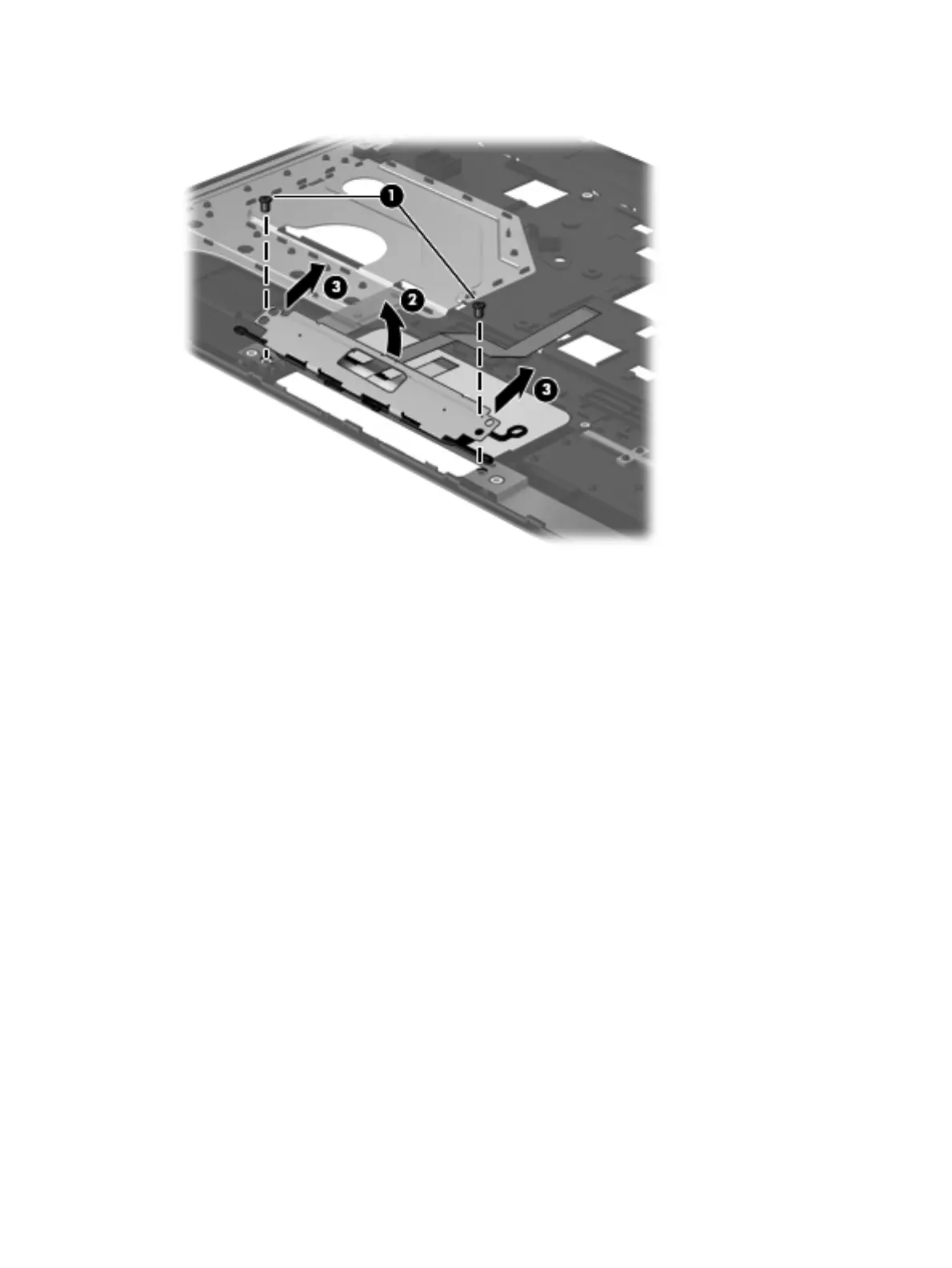 Remove the TouchPad button board (3) by sliding it away from the top cover at an angle.