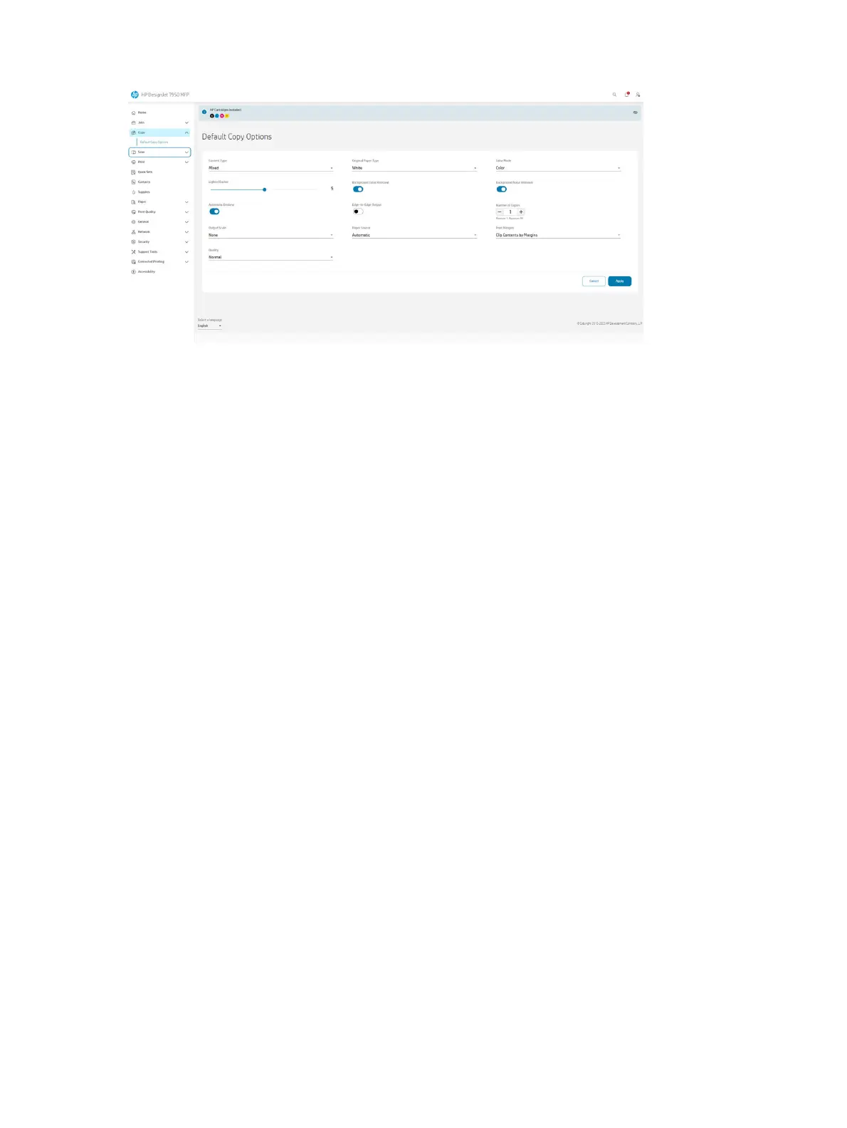 Sommige van de standaard-kopieerinstellingen worden weergegeven. Tik op Settings (Instellingen) om